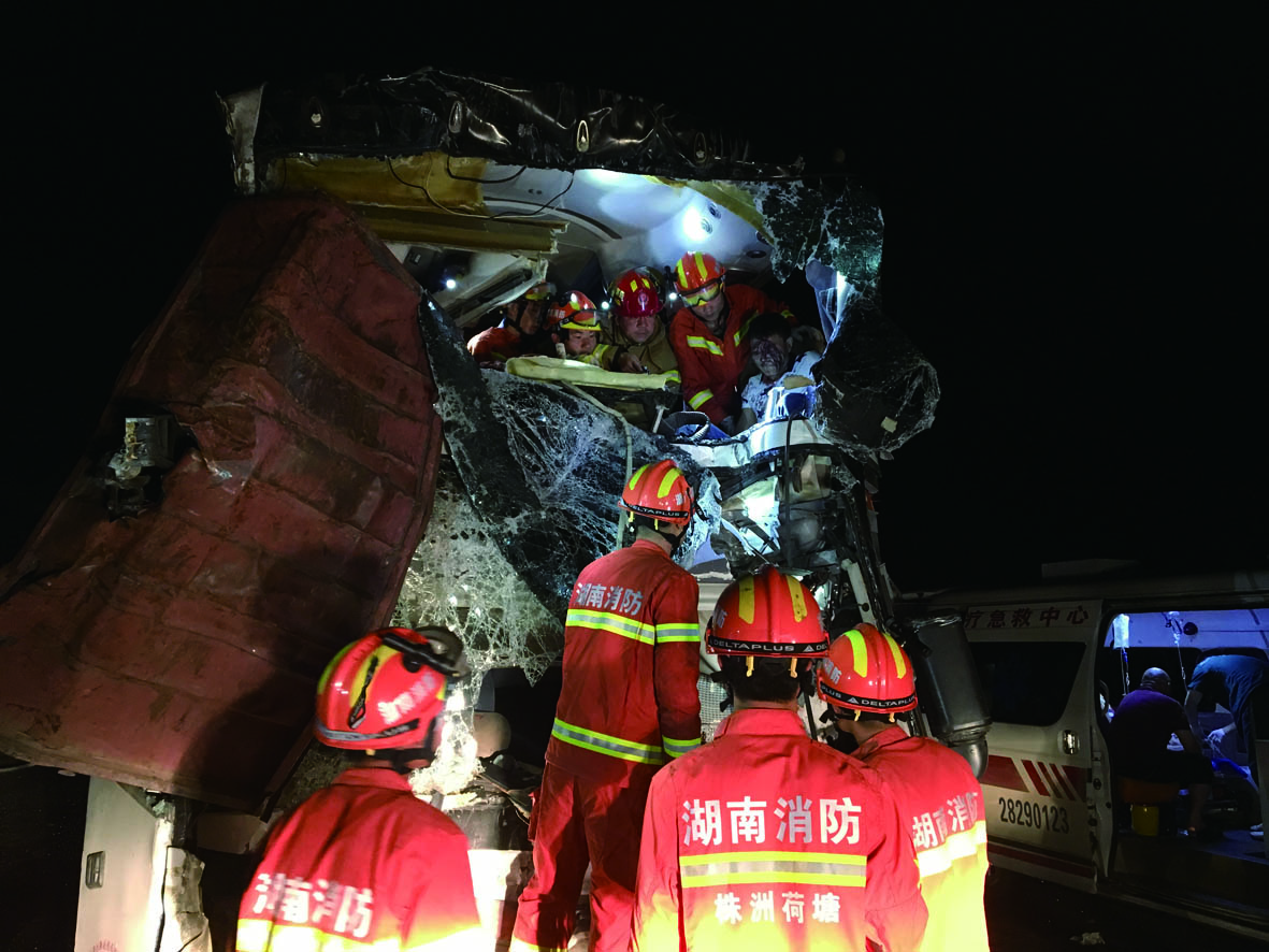 事发后,荷塘区消防中队和醴陵市消防中队的官兵相继赶到现场。消防员介绍,一辆大货车追了前面货车的尾,还被一辆河南牌照的客车追尾。大客车车头严重变形,男司机受伤被困,上层车厢前排的4名乘客也被困,其余乘客已被高速交警安全疏散。