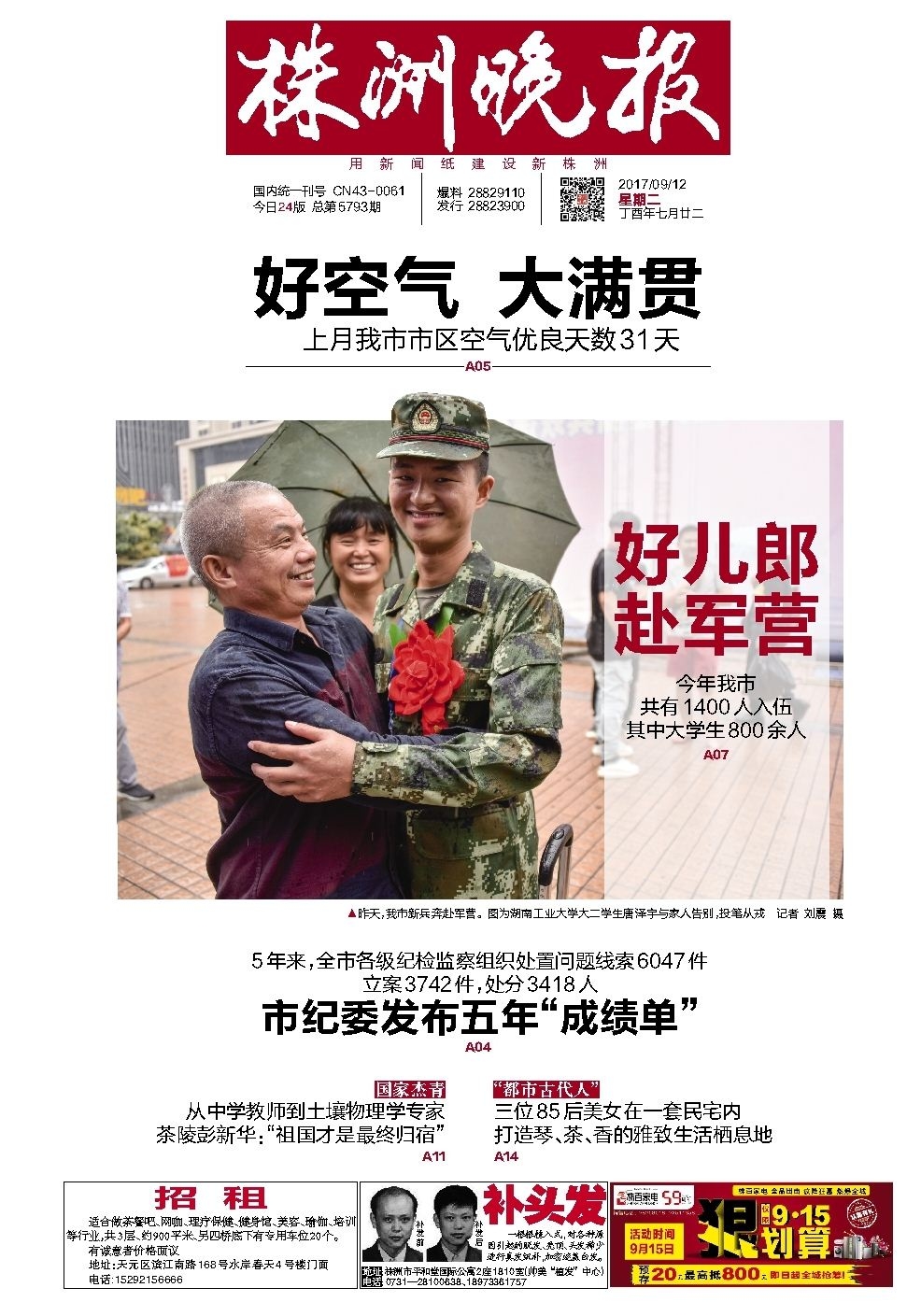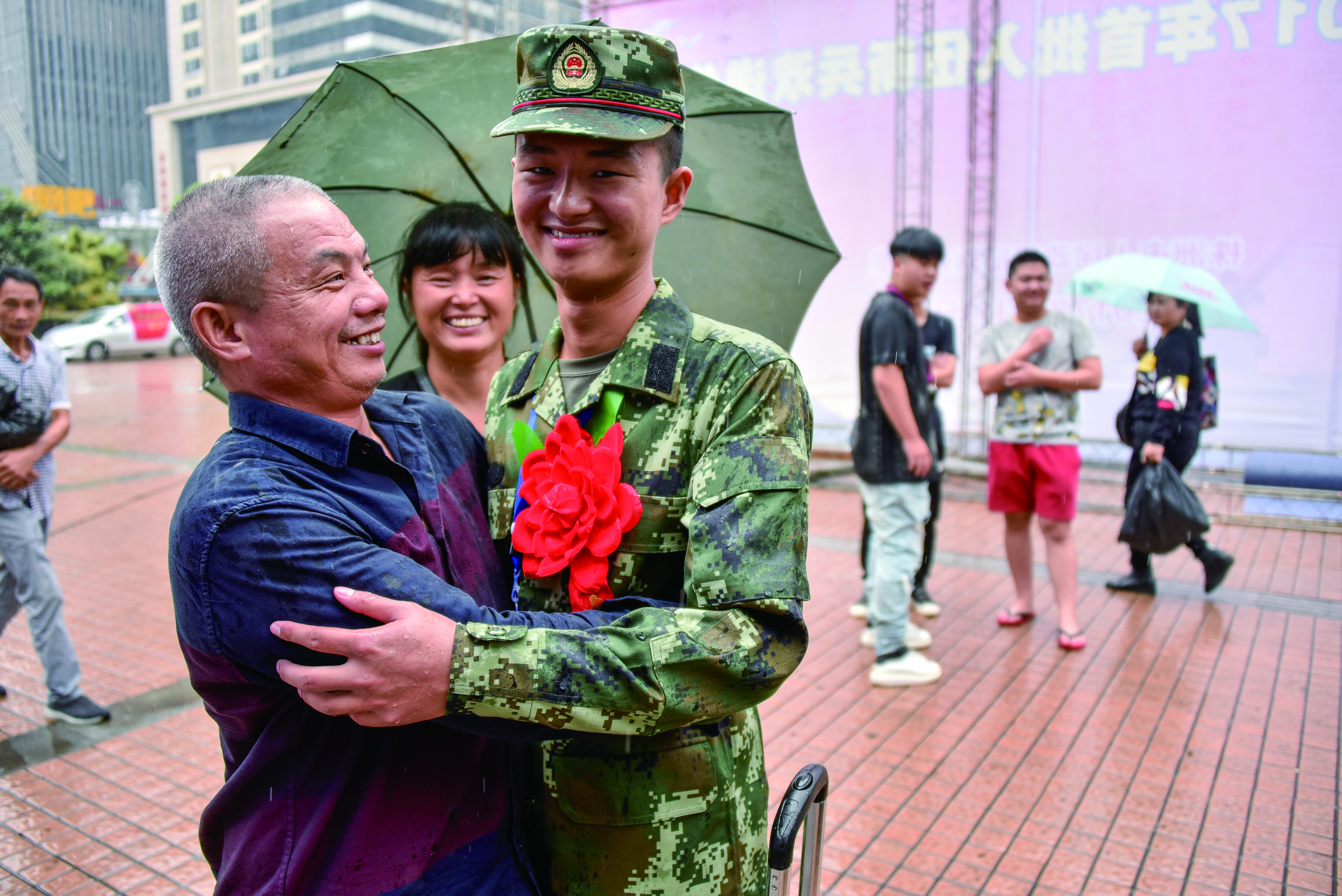 ▲昨天,我市新兵奔赴军营。图为湖南工业大学大二学生唐泽宇与家人告别,投笔从戎 记者 刘震 摄