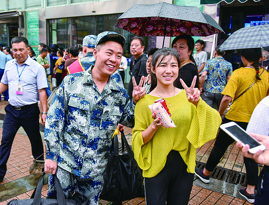 ▶9月11日,1400名新兵奔赴海陆空、火箭军和武警各部队。图为新兵出发前和亲朋好友合影留念 记者 刘震 摄