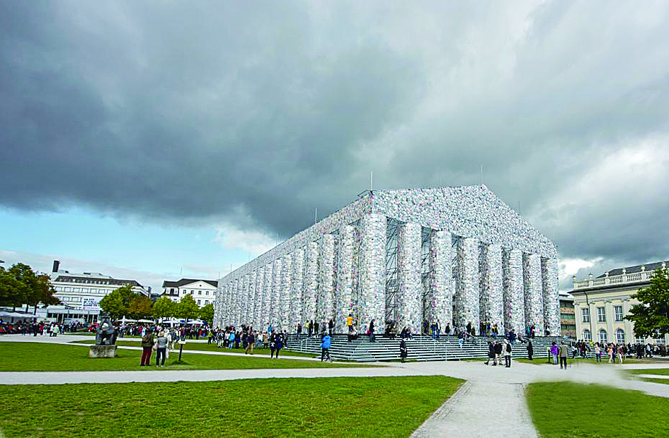 当地时间9月9日,德国卡塞尔文献展上,阿根廷艺术家玛塔米努欣用10万本书搭建而成的“书之帕特农神庙”展出。本届卡塞尔文献展的主题为“以雅典为鉴”,最引人注目的就是在弗里德里希广场上的作品“书之帕特农神庙”。