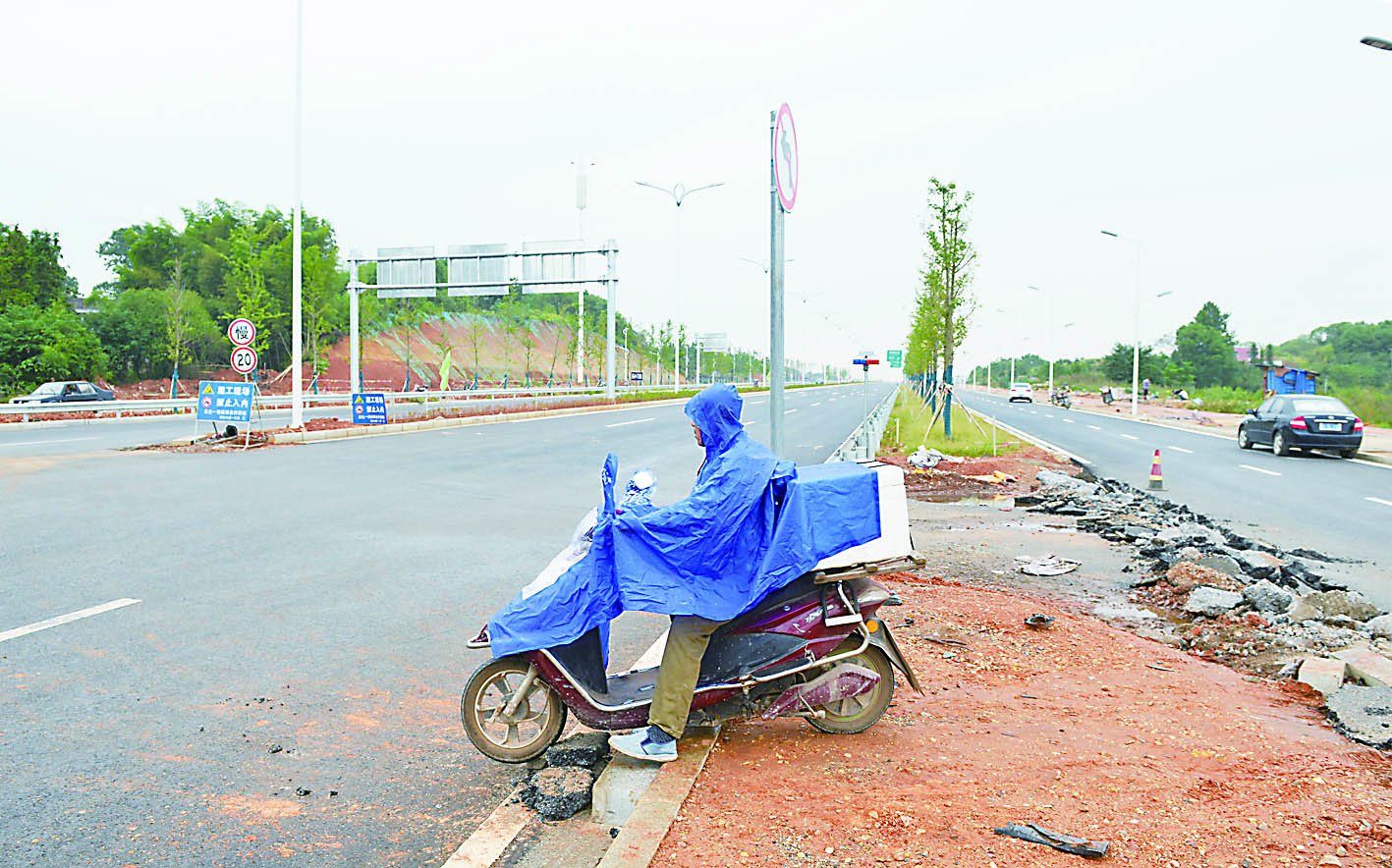 ▲9月12日,群丰镇长岭社区,居民骑着摩托穿越湘江大道 记者 谢慧 摄