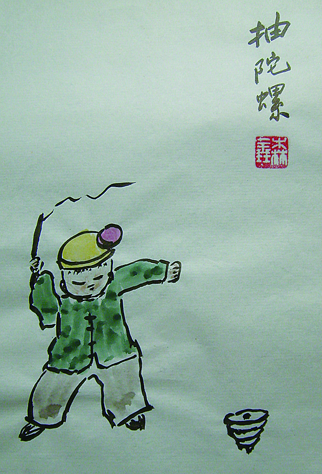 “不知是谁的陀螺顶面中间钉了一根棉线,转动的时候,将鞭尾垂下去,与棉线纠合,像钓鱼一样,当提起鞭子时,陀螺也随着悬空,还在不停地转。这种‘钓鱼’法,很有味道,因已隔多年,想不起这种陀螺是谁的了。”(刘克定《杨柳儿活,抽陀螺》)