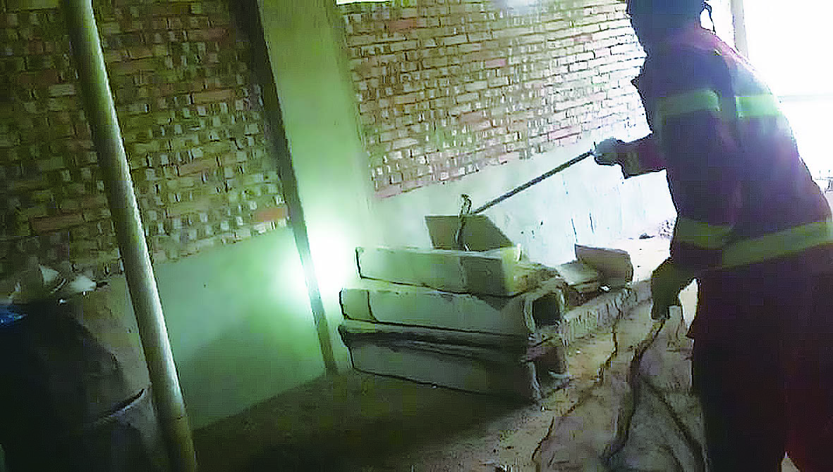 攸县消防中队副中队长郑启介绍,他们到场后经过一番搜寻,在一堆水泥块下发现了这条蛇,一名消防员用捕蛇器将它夹出。