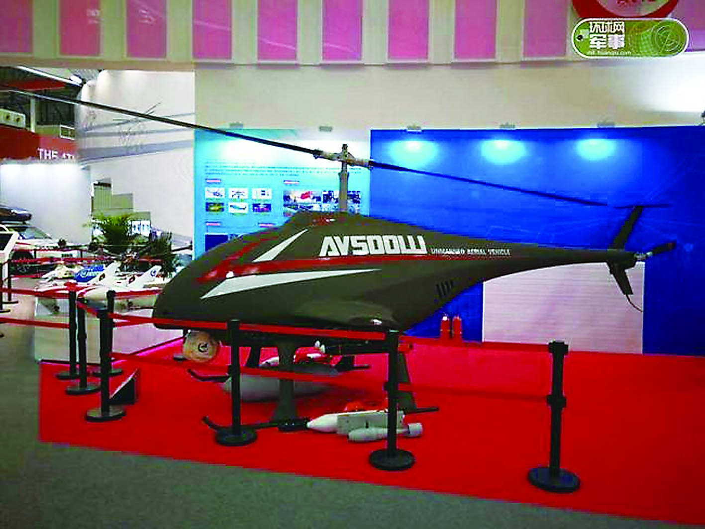 近日,中国航空工业集团公司(中航工业)在第四届中国天津国际直升机博览会上,展出了首款无人武装直升机AV500W。该机长7.2米,由中航工业位于江西景德镇的直升机设计研究所开发制造,最大起飞重量为450公斤,最大航速每小时170公里,飞行高度可达4000米。