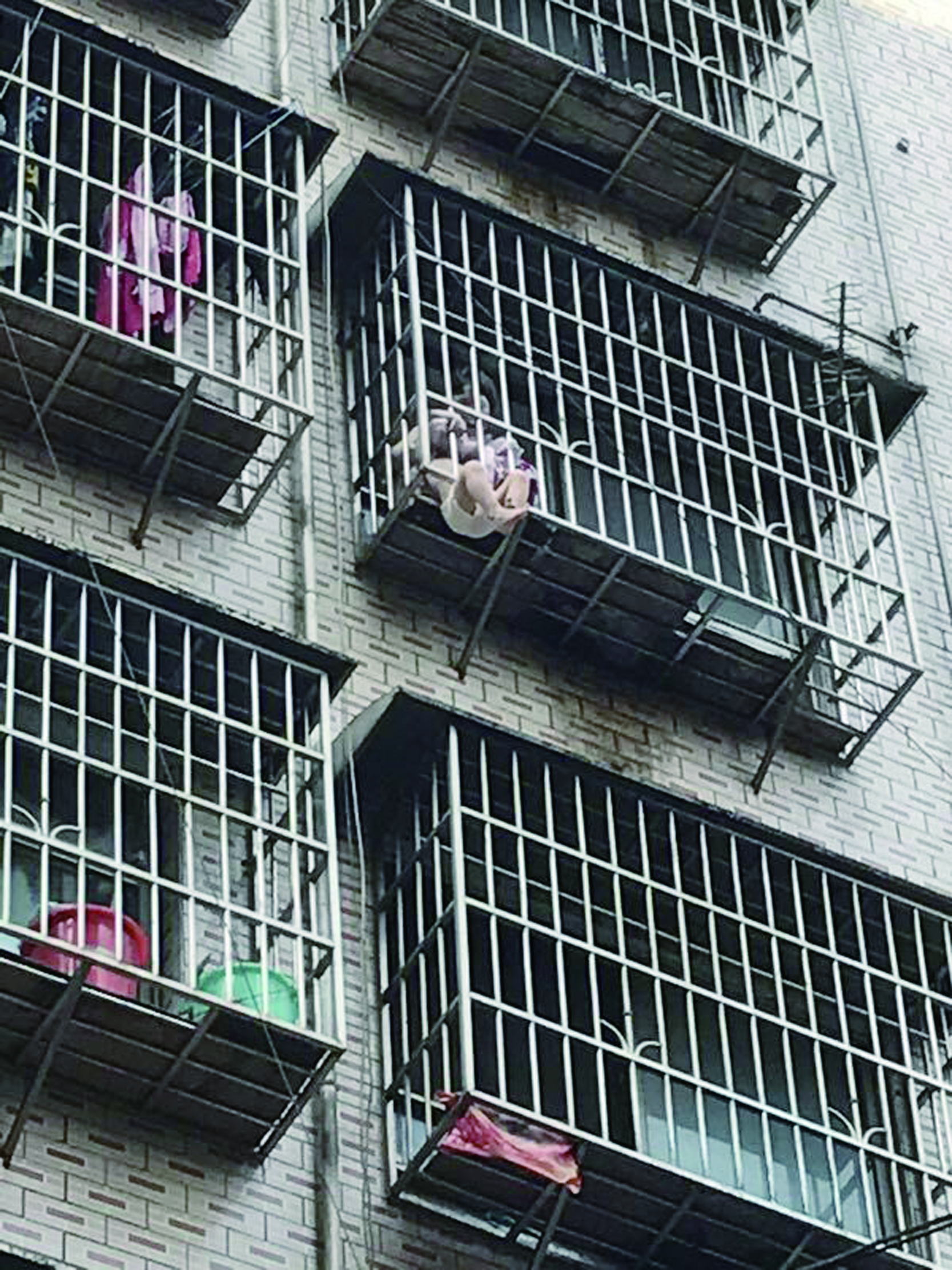 ◀4岁女孩琪琪卡在防盗网间隙中,母亲拼死拉住她 邓先生 供图