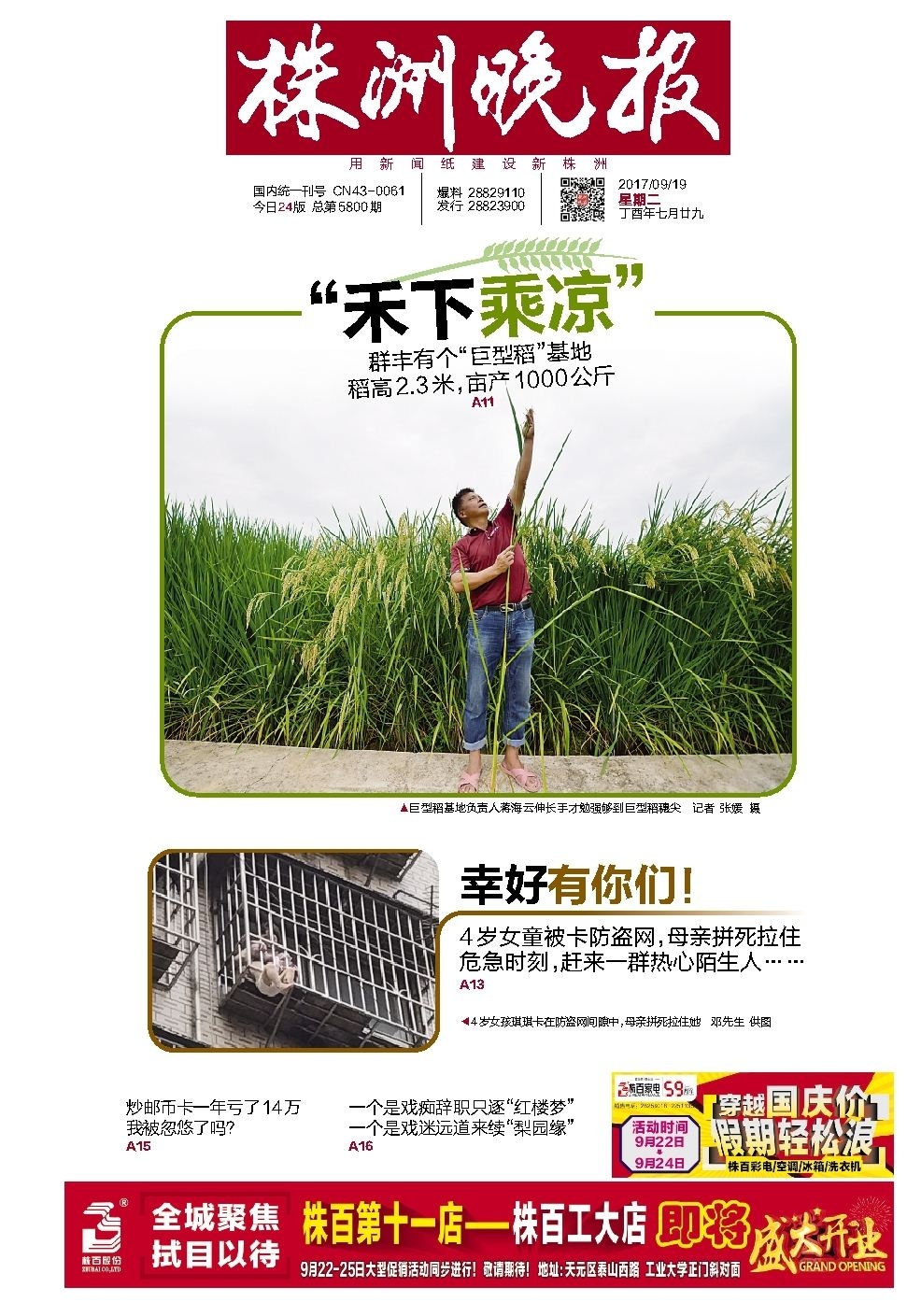 ▲巨型稻基地负责人蒋海云伸长手才勉强够到巨型稻穗尖 记者 张媛 摄