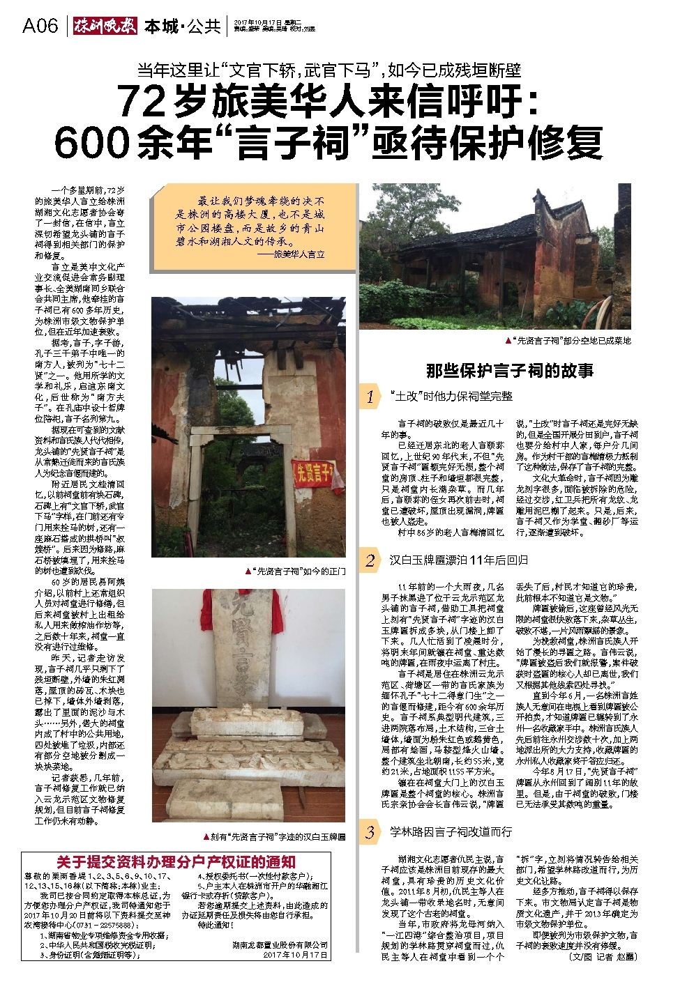 72岁旅美华人来信呼吁: 600余年“言子祠”亟待保护修复