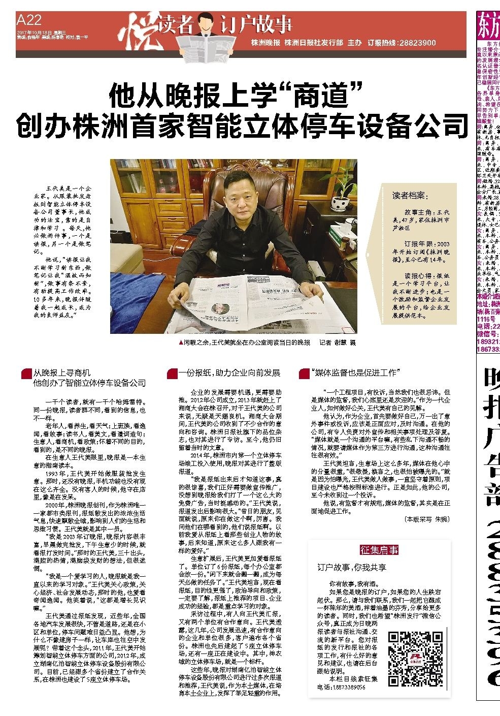 他从晚报上学“商道” 创办株洲首家智能立体停车设备公司