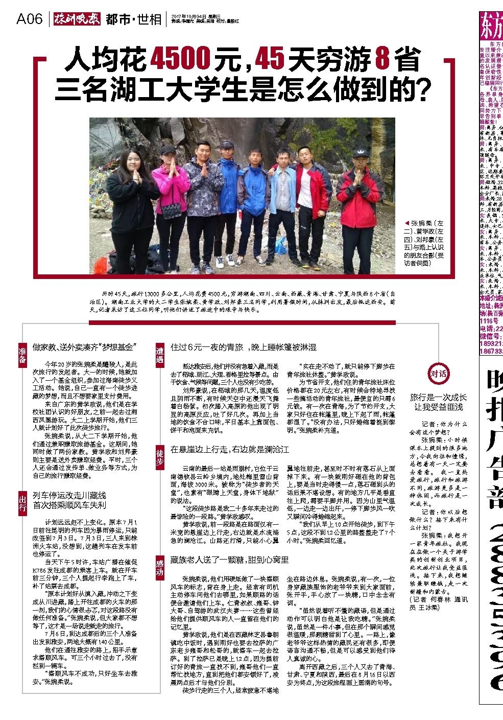 历时45天,旅行13000多公里,人均花费4500元,穷游湖南、四川、云南、西藏、青海、甘肃、宁夏与陕西8个省(自治区)。湖南工业大学的大二学生张婉柔、黄学政、刘邦豪三名同学,利用暑假时间,从株洲出发,最后抵达西安。前天,记者采访了这三位同学,听他们讲述了旅途中的艰辛与快乐。