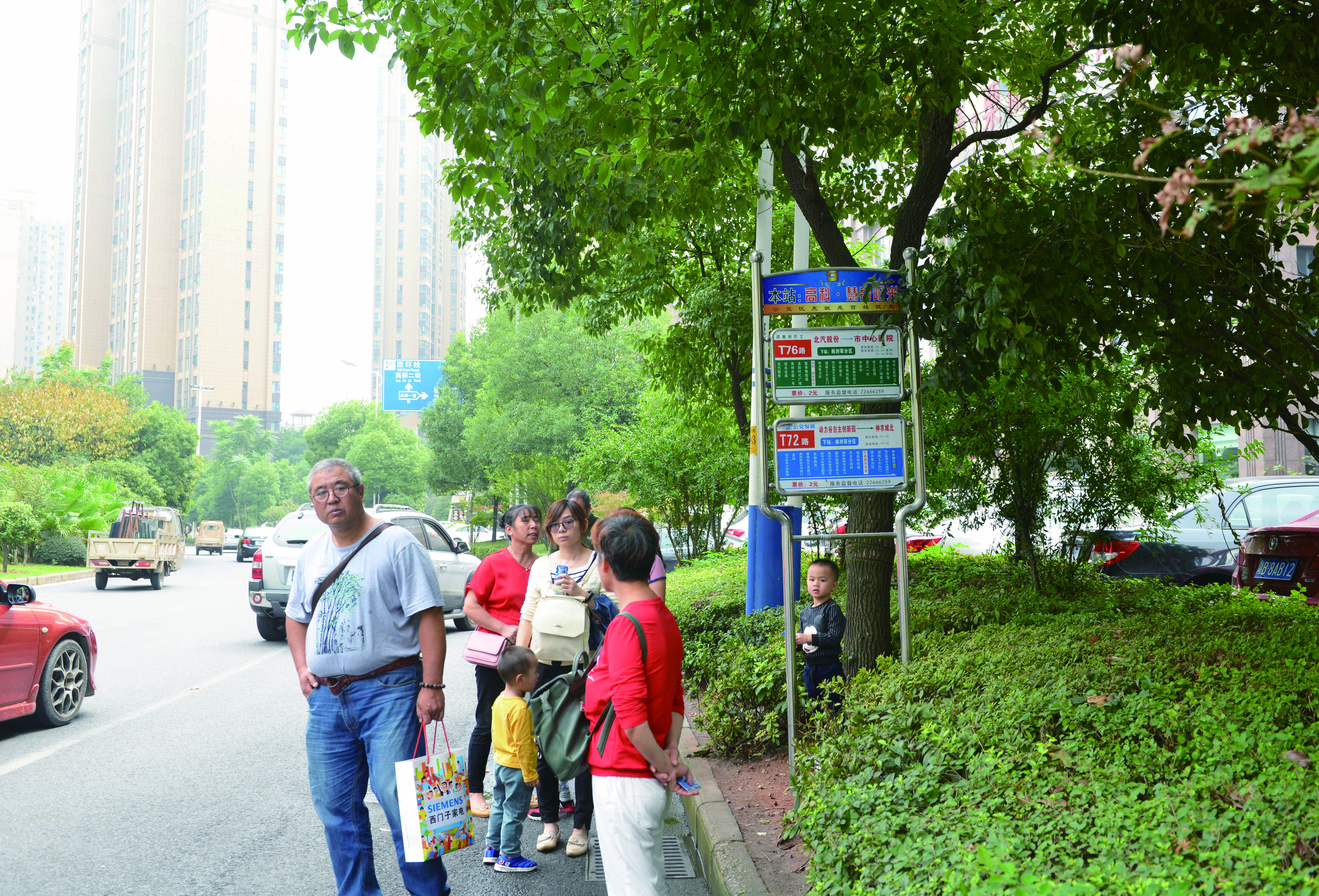 前日上午,记者来到现场看到,这里有T72、T76路公交车经过,站牌确实立在绿化带里,并没有设置乘客候车区域,乘客候车要么站在绿化带的树丛中,要么站在马路边,面对的是穿梭的车流。记者注意到,由于乘客候车,绿化带里有的地方土壤已经被踩紧。