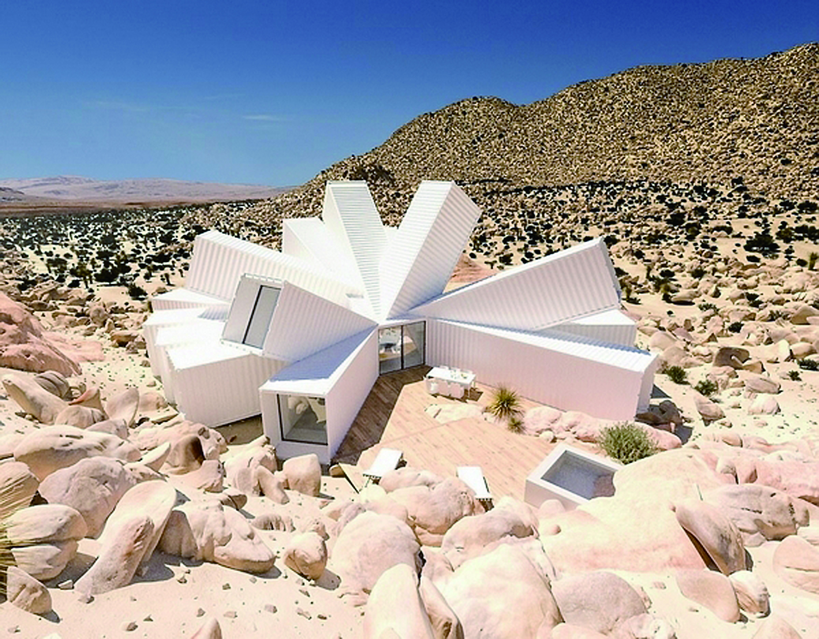 据悉,这座建筑名为“约书亚树宅院”,面积达2150平方英尺(约200平方米),共有3套卧室、1间厨房和1间客厅。其外部结构的建筑材料是集装箱,室内由车库上方的太阳能板发电。