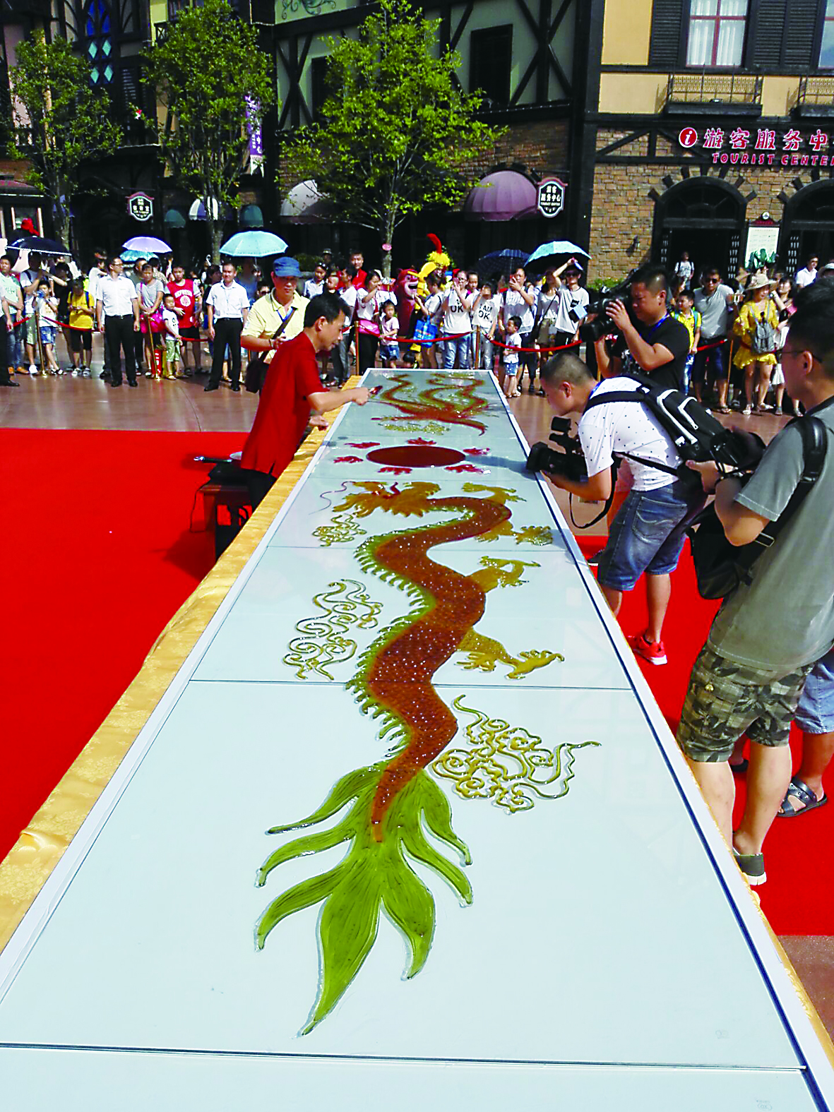 ▲今年8月,龙泽宏现场制作“龙凤呈祥”,长8.18米、宽1米,用了80多斤麦芽糖 记者 何春林 摄