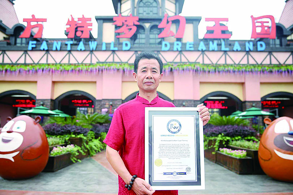近日,52岁的龙泽宏收到了一封来自世界纪录认证机构(WRCA)的认证证书(编号WRC170915F)——他创作的“龙凤呈祥”糖画被认证为世界最大的平面糖画。