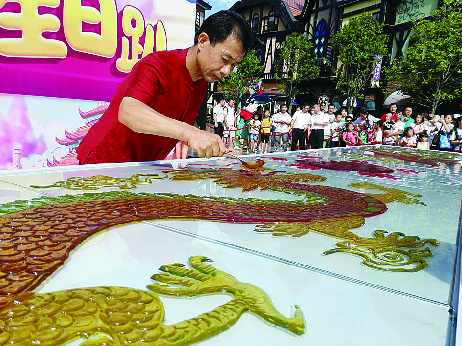 今年8月,株洲方特欢乐世界举办糖果派对节日活动,龙泽宏受邀在现场创作了一幅以“龙凤呈祥”为主题的巨幅糖画。8月18日上午,伴随着音乐,他现场熬制糖浆,在观众围观下,给这幅糖画进行最后的“画龙点睛”工序。