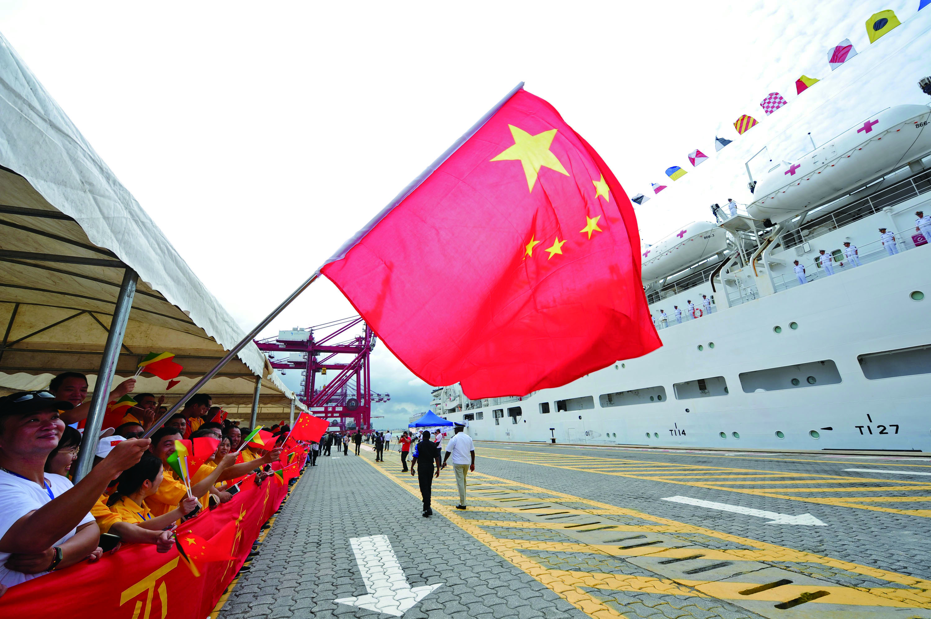 10月10日,在刚果(布)黑角港码头,人们欢迎中国海军和平方舟医院船到访。