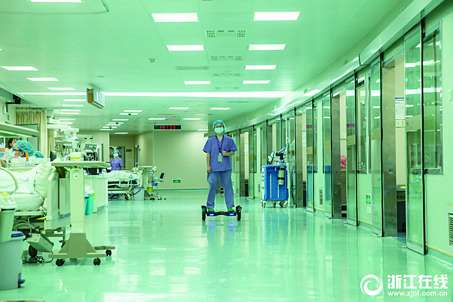 10月11日,浙医二院滨江院区,ICU病房的工作人员脚踩平衡车,风一样地穿梭在走廊。遇上紧急抢救时刻,大家再也不用狂奔了,骑上“风火轮”,加速救援不在话下,这样便可以把更多的时间还给病人。