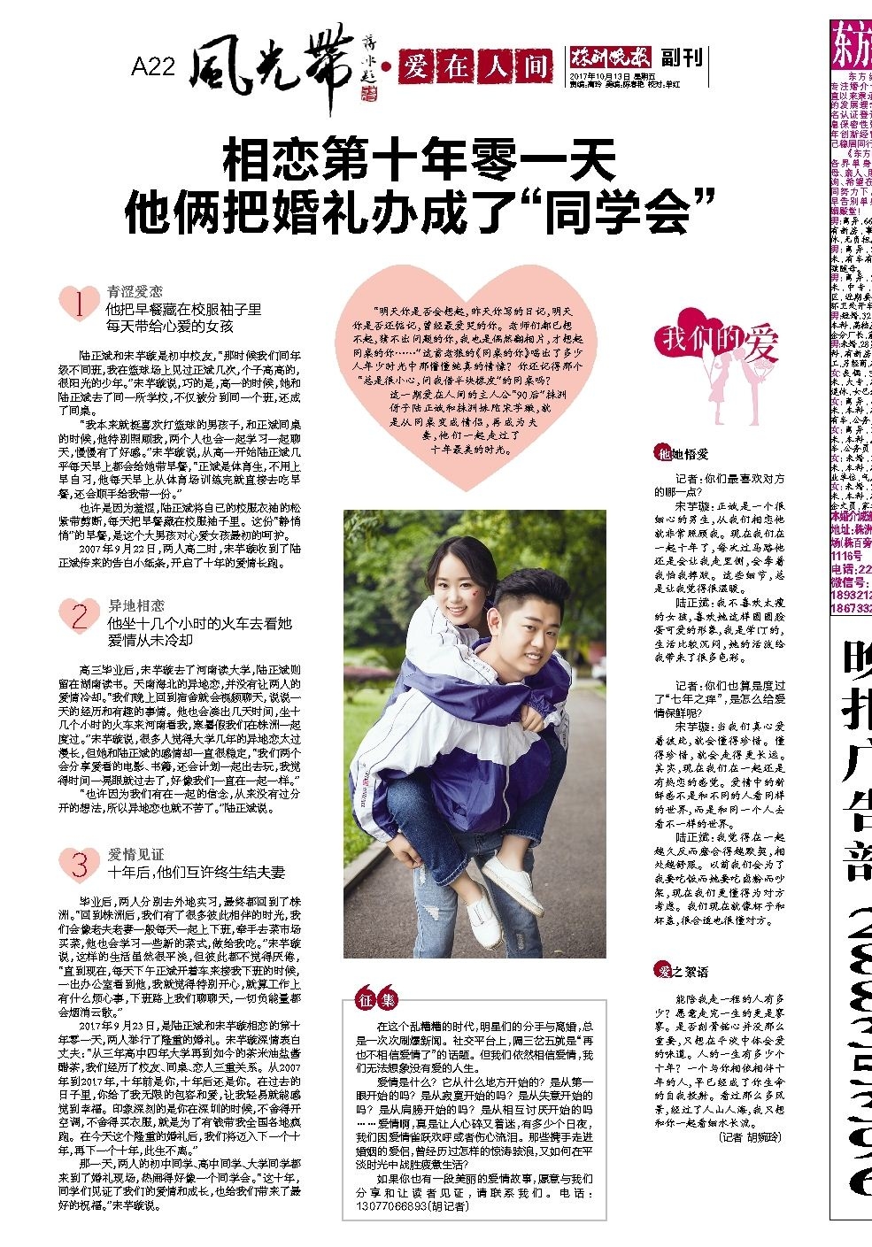 如果你也有一段美丽的爱情故事,愿意与我们分享和让读者见证,请联系我们。电话:13077066893(胡记者)