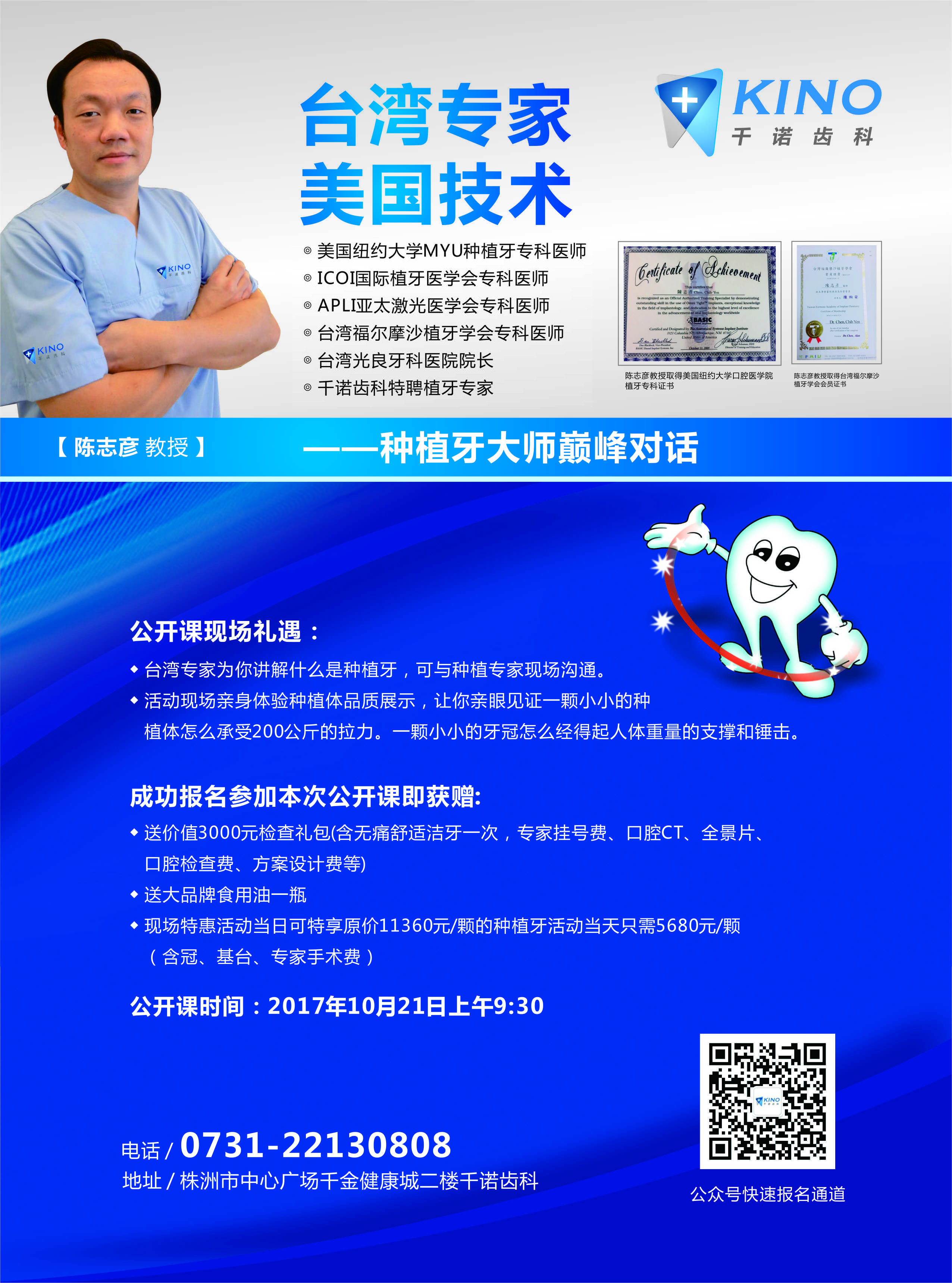 为了让现场的市民能有更多的收获,此次活动,将特邀美国纽约大学医学院种植牙专家陈志彦现场坐诊。专家不仅会与市民们一起现场见证种植牙耐受力实验,还将为大家提供一对一亲诊服务,现场讲座,带着问题来,让专家给你一个好建议吧!