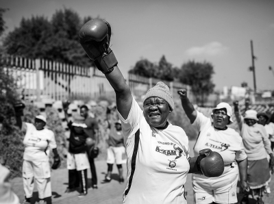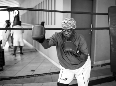 南非民众喜欢拳击运动是有历史传统的,练习场上都设备齐全。这些老人们根本不在乎自己已经上了年纪,她们也要好好地再次融入周围的社会。前健美运动员克洛德·马佛萨已经在“大都市”俱乐部拳击场任职四年,他是老人们的专职教练。每次训练开始前,他都和老人们一起携手静默几分钟,帮助她们集中精神,再带领她们练习抛实心的“药球”(一种锻炼用的重球)。