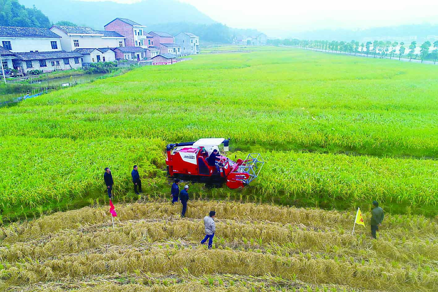 ◀千亩富硒稻喜丰收,收割机在田地作业