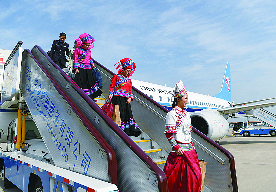 ◀10月16日,来自广西壮族自治区的党的十九大代表乘飞机抵达首都国际机场