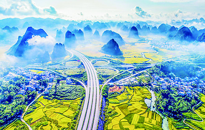 合那高速公路(合浦县到那坡县)位于广西壮族自治区典型的喀斯特地貌山区,沟深坡陡,桥隧比例为31%。该公路在山水画廊中蜿蜒穿梭,百大特大桥像飘在空中的白云穿越三座大山,与沿途湛蓝的天空、温柔的山川、绚丽的野花、青缈的云雾和谐地融合在一起,构成了一幅令人惊叹的壮丽画卷。