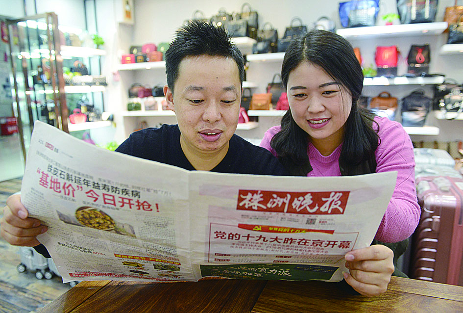晚报关于“十九大”的报道,引起老百姓的关注。图为昨天,芦淞市场群的商户在阅读《株洲晚报》,关注“十九大”新闻。