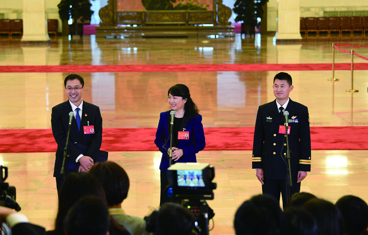 ▲10月19日,中国共产党第十九次全国代表大会代表孟祥飞、李媛、曹先建(自左至右)在北京人民大会堂接受采访