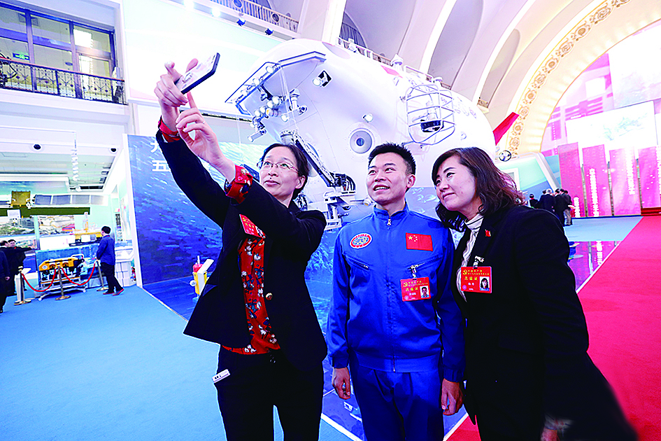 不忘初心 不负时代 ——十九大代表参观“砥砺奋进的五年”大型成就展 10月19日晚,参加中国共产党第十九次全国代表大会的代表在北京展览馆参观“砥砺奋进的五年”大型成就展。图为十九大代表、国家海洋局国家深海基地管理中心潜航员唐嘉陵(中)与参观展览的代表在“蛟龙”号模型前合影。 (据人民网)