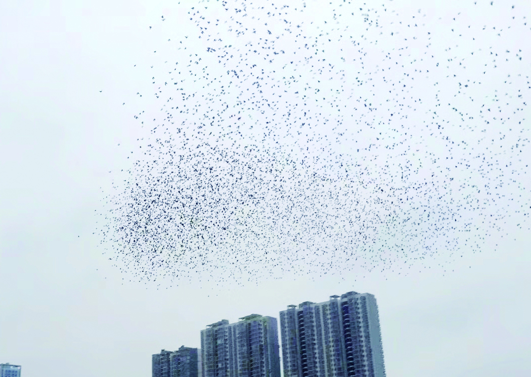 ▲成群的麻雀在白石港附近上空飞舞,场面壮观 记者 戴凛 摄