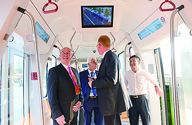 ▲德国专家体验智轨快运系统 记者 谭浩瀚 摄