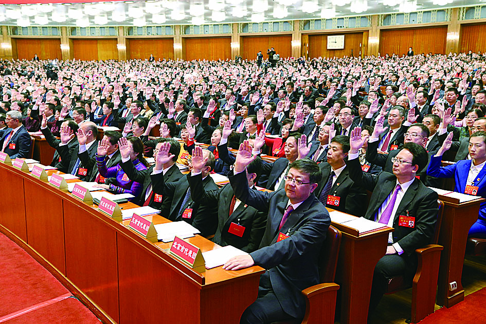 ▲2017年10月24日,中国共产党第十九次全国代表大会闭幕会在北京人民大会堂举行。图为代表举手表决