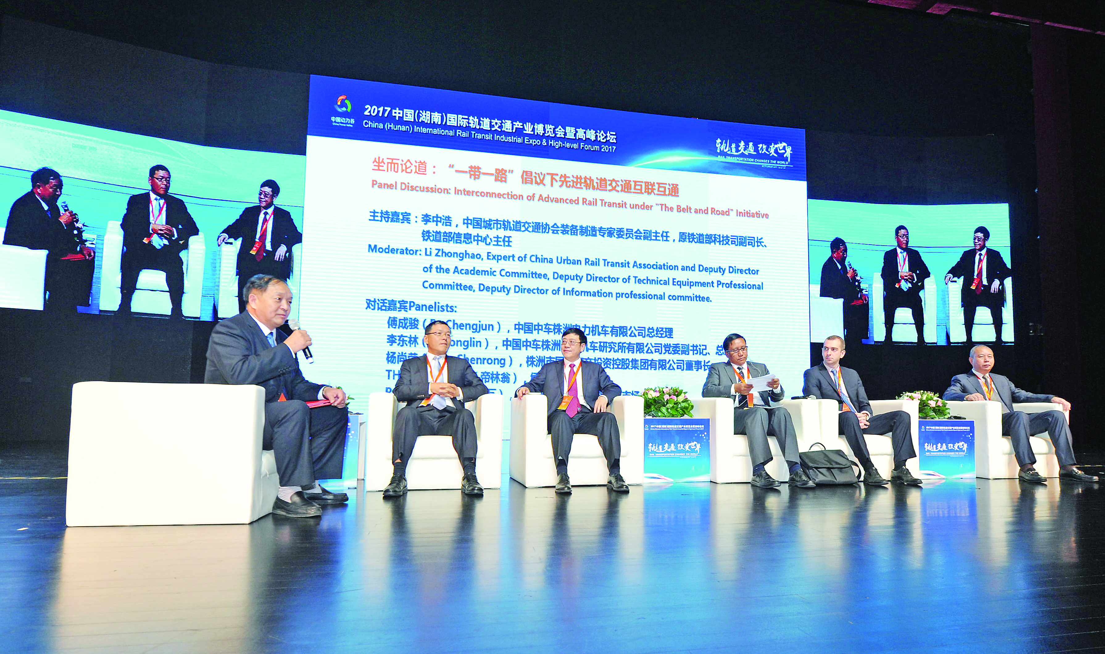昨天,“轨交会”还举行了“坐而论道”圆桌对话——中车株洲电力机车有限公司总经理傅成骏、中车株洲电力机车研究所有限公司总经理李东林、株洲国有资产投资控股集团公司董事长杨尚荣、缅甸驻华大使帝林翁、格鲁吉亚国家铁道总公司市场主管德瓦等,就“一带一路”框架下先进轨道交通的互联互通进行深入交流探讨。图为对话现场。