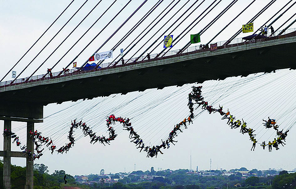 当地时间10月22日,在位于巴西圣保罗附近的荷托兰迪亚,245人身系绳索,共同从近30米高的桥上集体跳下,希望创造世界纪录。此前曾有149人共同完成这一项目。