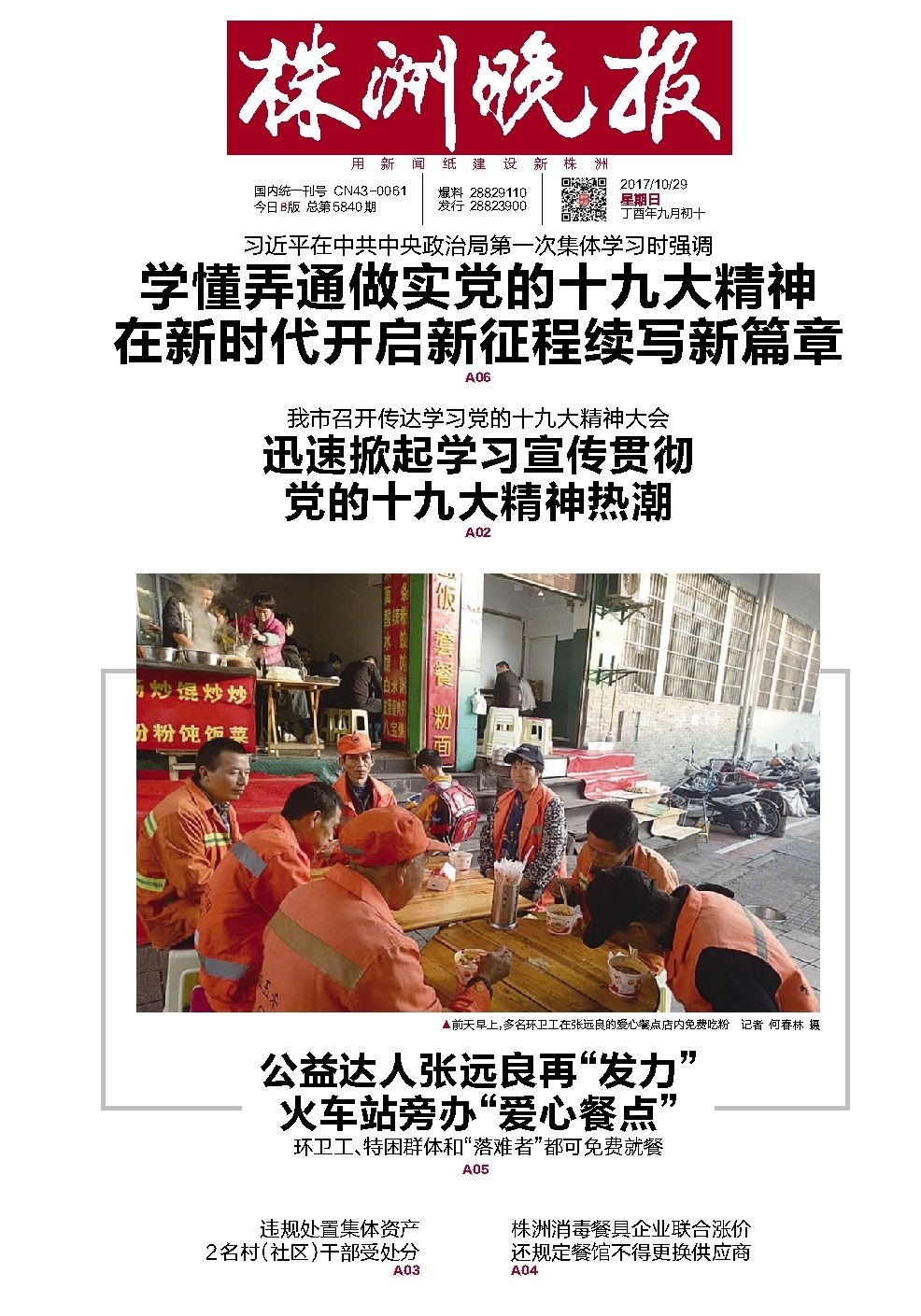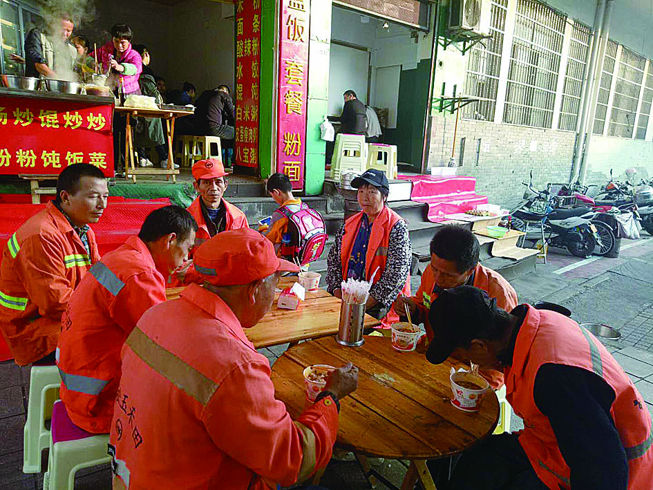 ▲前天早上,多名环卫工在张远良的爱心餐点店内免费吃粉 记者 何春林 摄