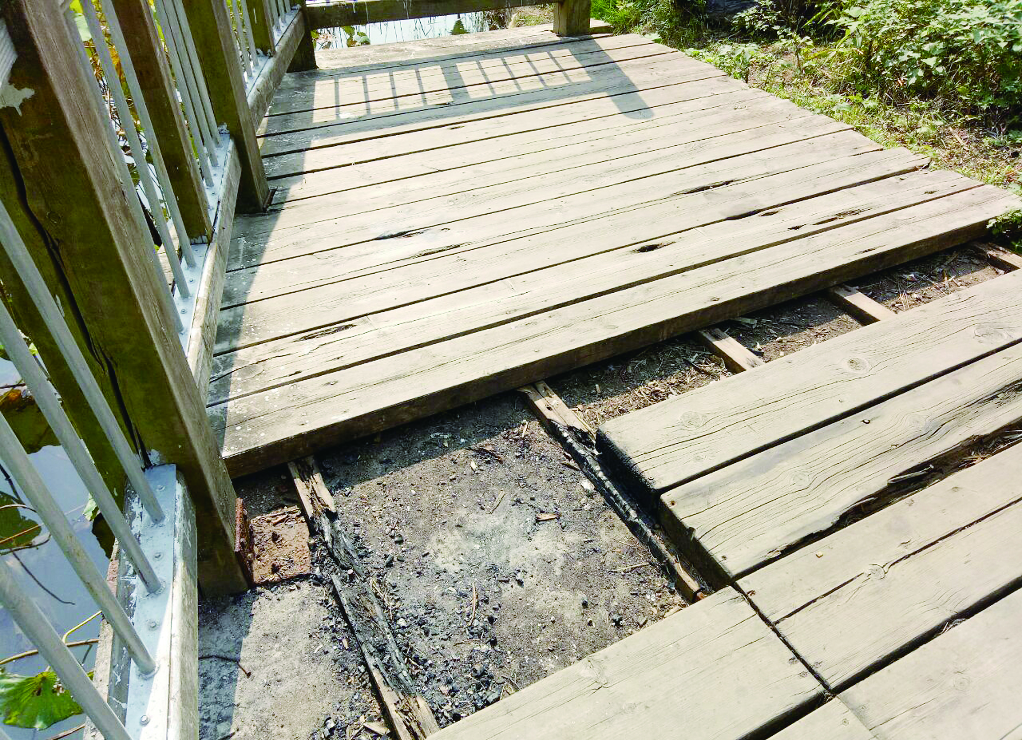 ▲石子湖公园,木栈道损坏严重 记者 谢慧 摄