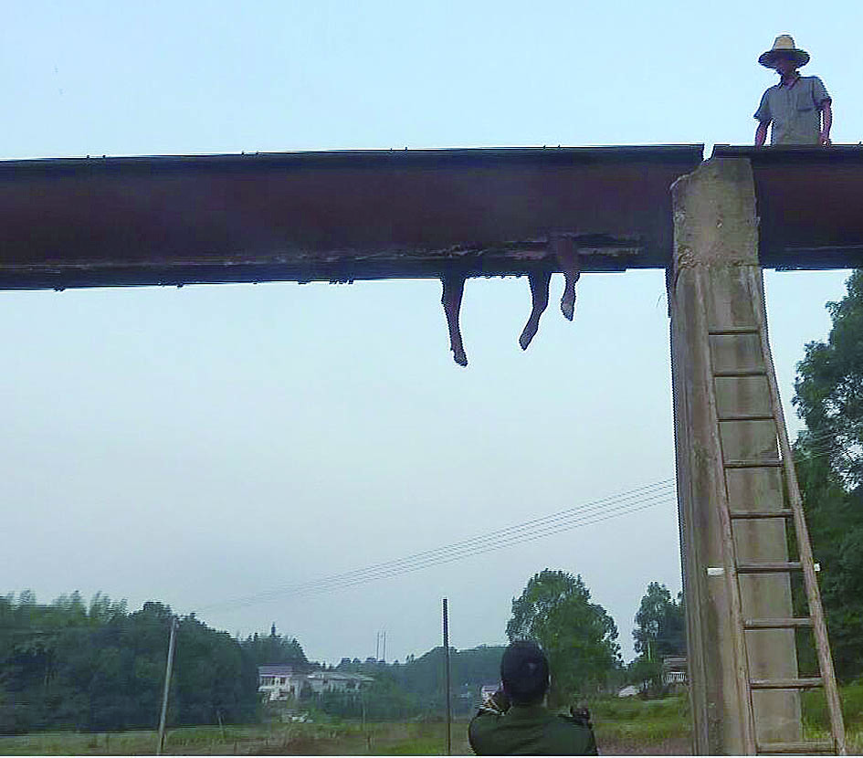 “我们爬木梯来到黄牛身边,发现牛背上方有四根铁杆,便用工具将铁杆切断,同时用绳索把它的四肢拉回槽内,希望它继续往前走。”贺治华说,然而,受了伤和惊吓的牛不愿往前走,村民们便拿来三脚架,想用绳索和三脚架把牛吊起来再降到地面。“不过,村民们找不到合适的支撑点,这个方法无法奏效。”