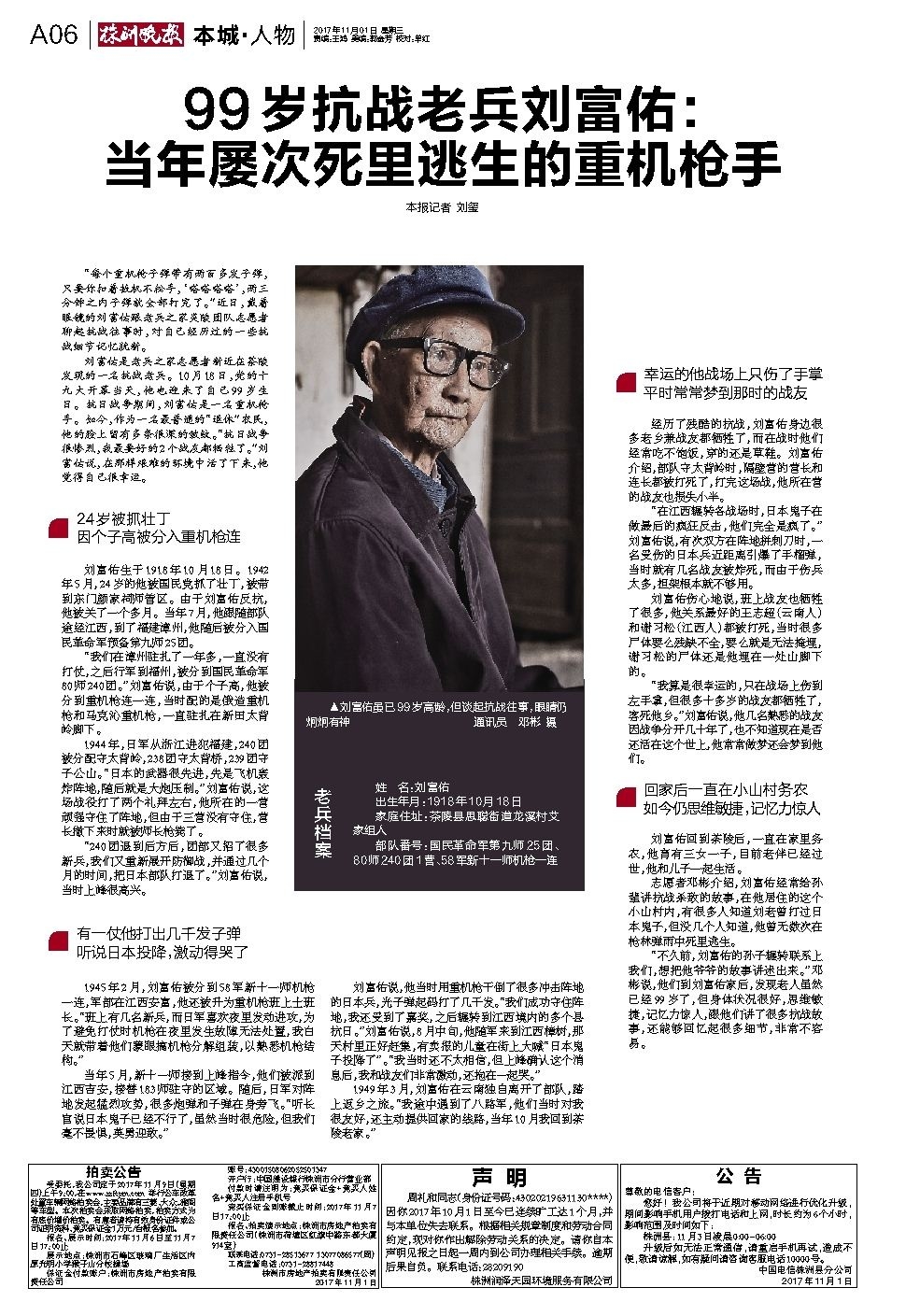 99岁抗战老兵刘富佑:当年屡次死里逃生的重机枪手