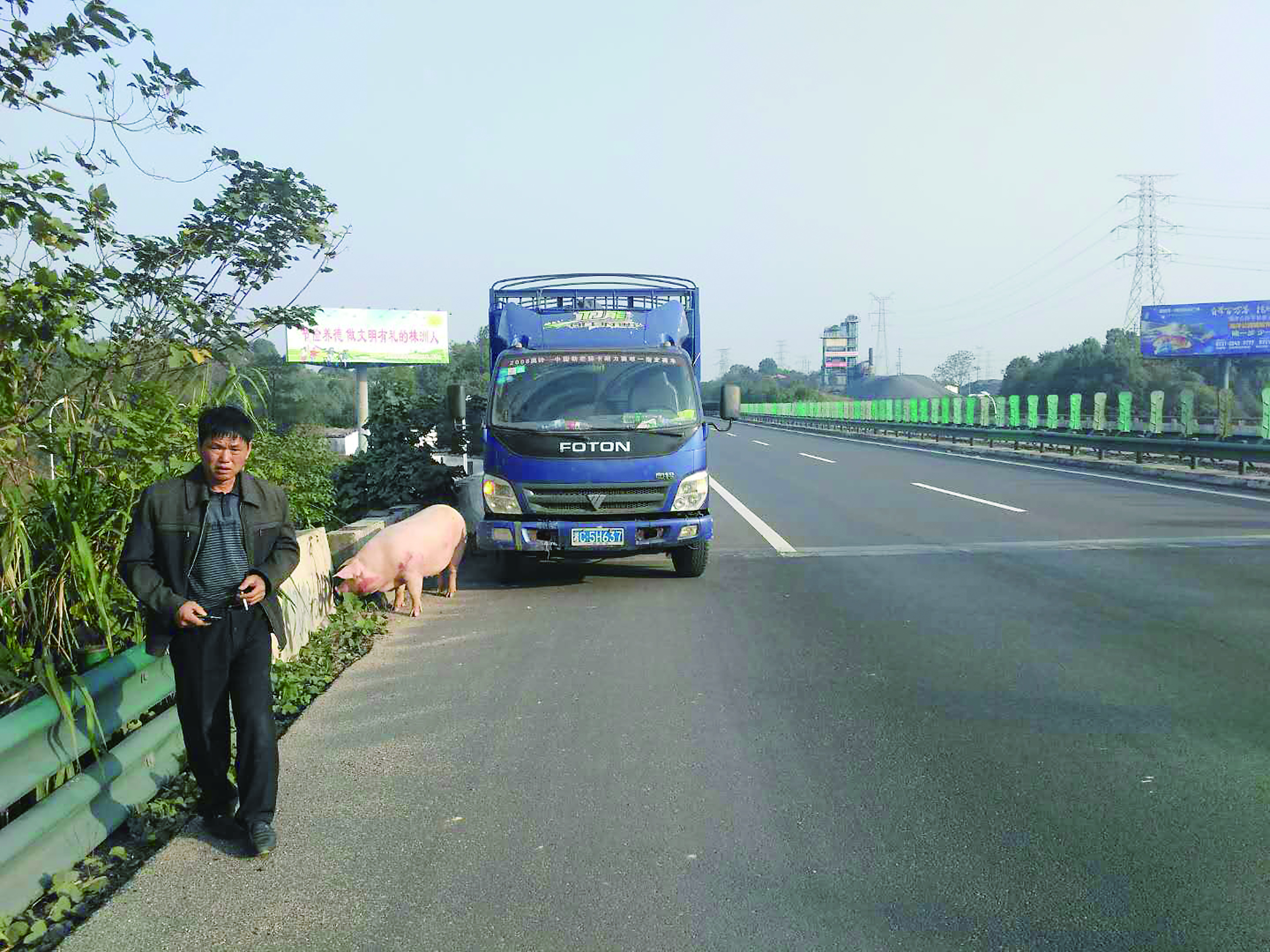 随后,张师傅把猪赶到应急车道上,但它有300斤重,张师傅根本抬不动,急得满头大汗。