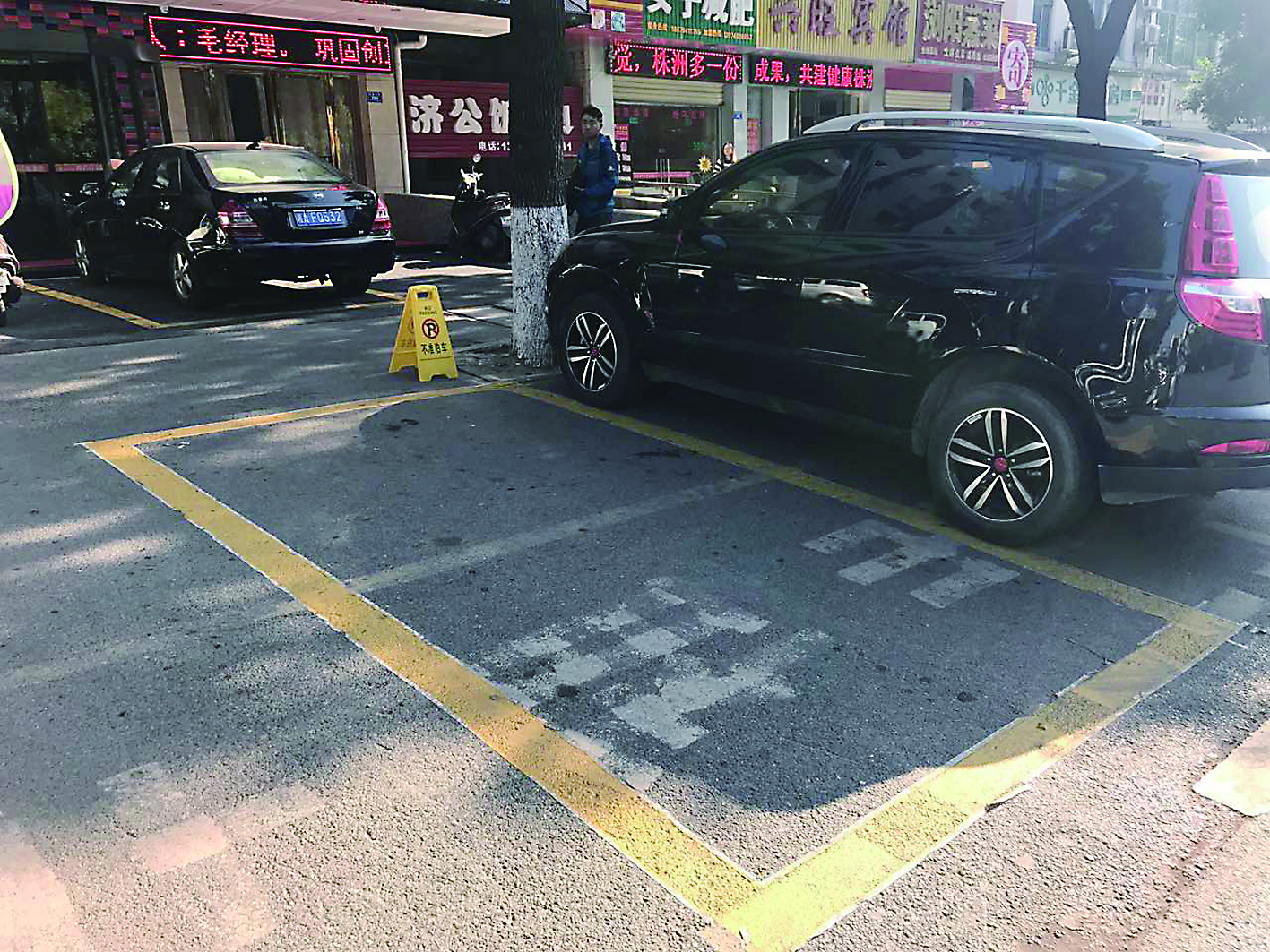 究竟是何人所为?记者咨询了该酒店以及两侧数个门店,一门店老板称是前几天该酒店工作人员划的线,方便顾客停车。