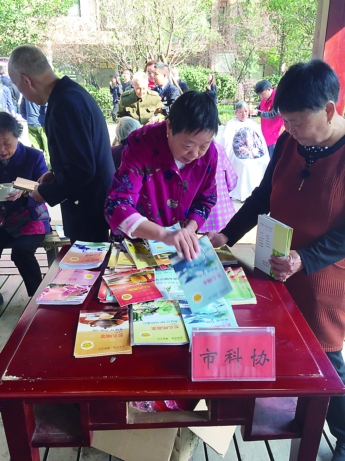 ▲科普工作人员现场向老人发放科普知识读本 通讯员供图