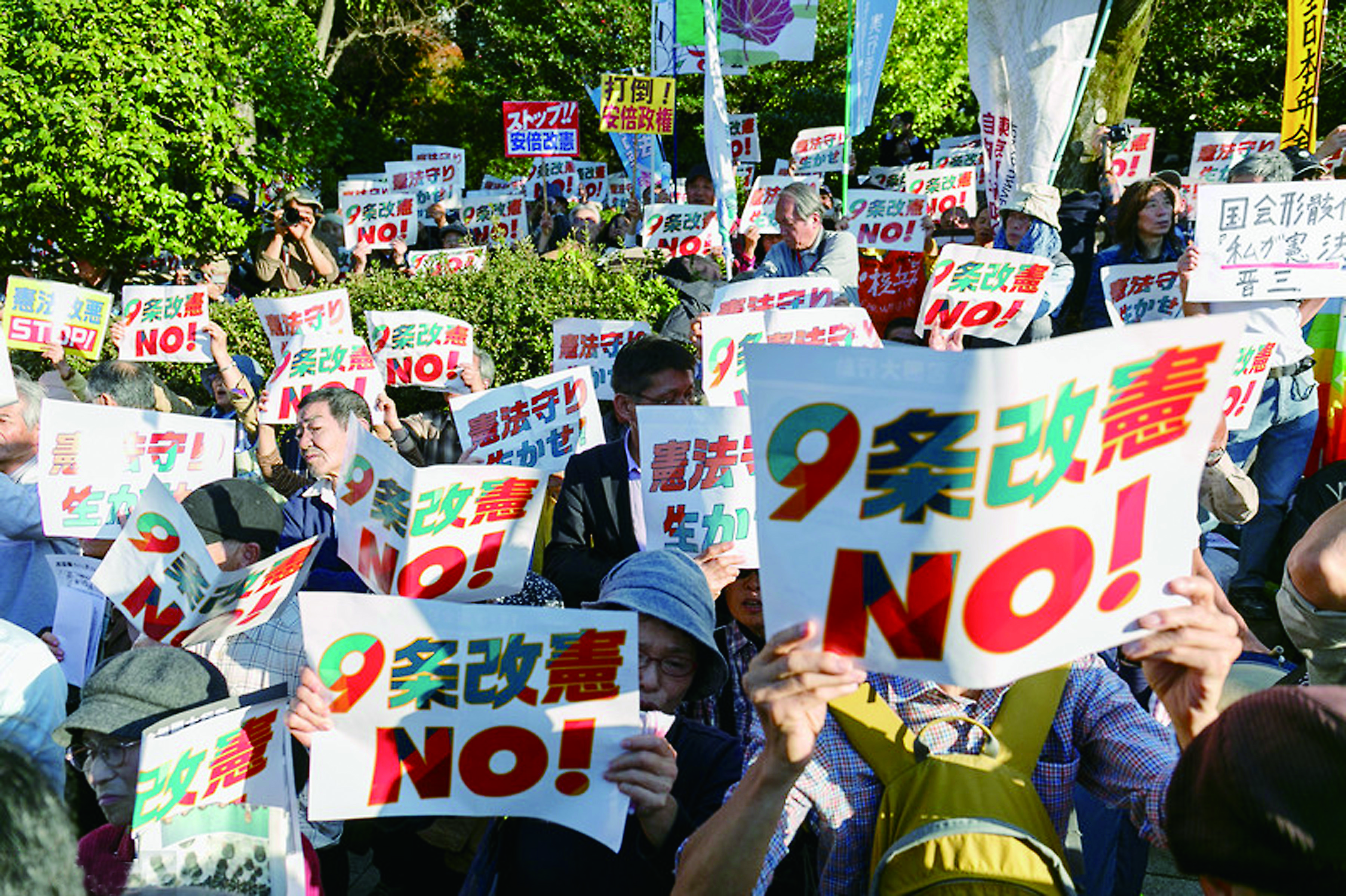 日本民众集会反对安倍修宪 日本大量民众3日在东京国会附近举行抗议集会,反对安倍政权修宪企图。 3日是日本和平宪法公布71周年纪念日。据主办方介绍,当天有4万多人参加抗议集会。抗议者手持“反对安倍修宪”等标语,高喊“不要战争”“保护宪法第9条”等口号。集会后,部分抗议者还参加了“包围国会”大游行。 《日本国宪法》于1946年11月3日公布,次年5月3日正式实施。宪法第9条规定,日本永远放弃发动战争这一国家主权,永远放弃以武力威胁或使用武力作为解决国际争端的手段。 今年5月3日,安倍在《读卖新闻》刊登的专访中发表修宪主张,称希望在宪法第9条中增加自卫队内容,并给出“2020年施行新宪法”的时间表。 (据新华社)