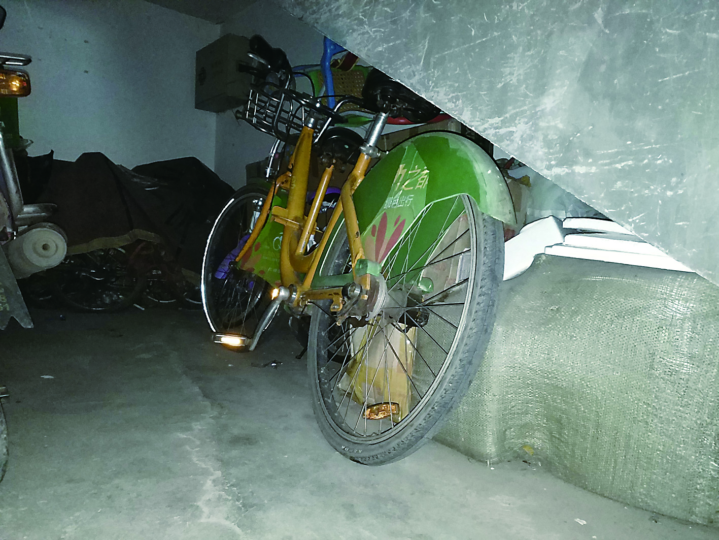 ▲昨日,大众家园小区,被遗弃在楼梯间的公共自行车 记者 姚时美 摄