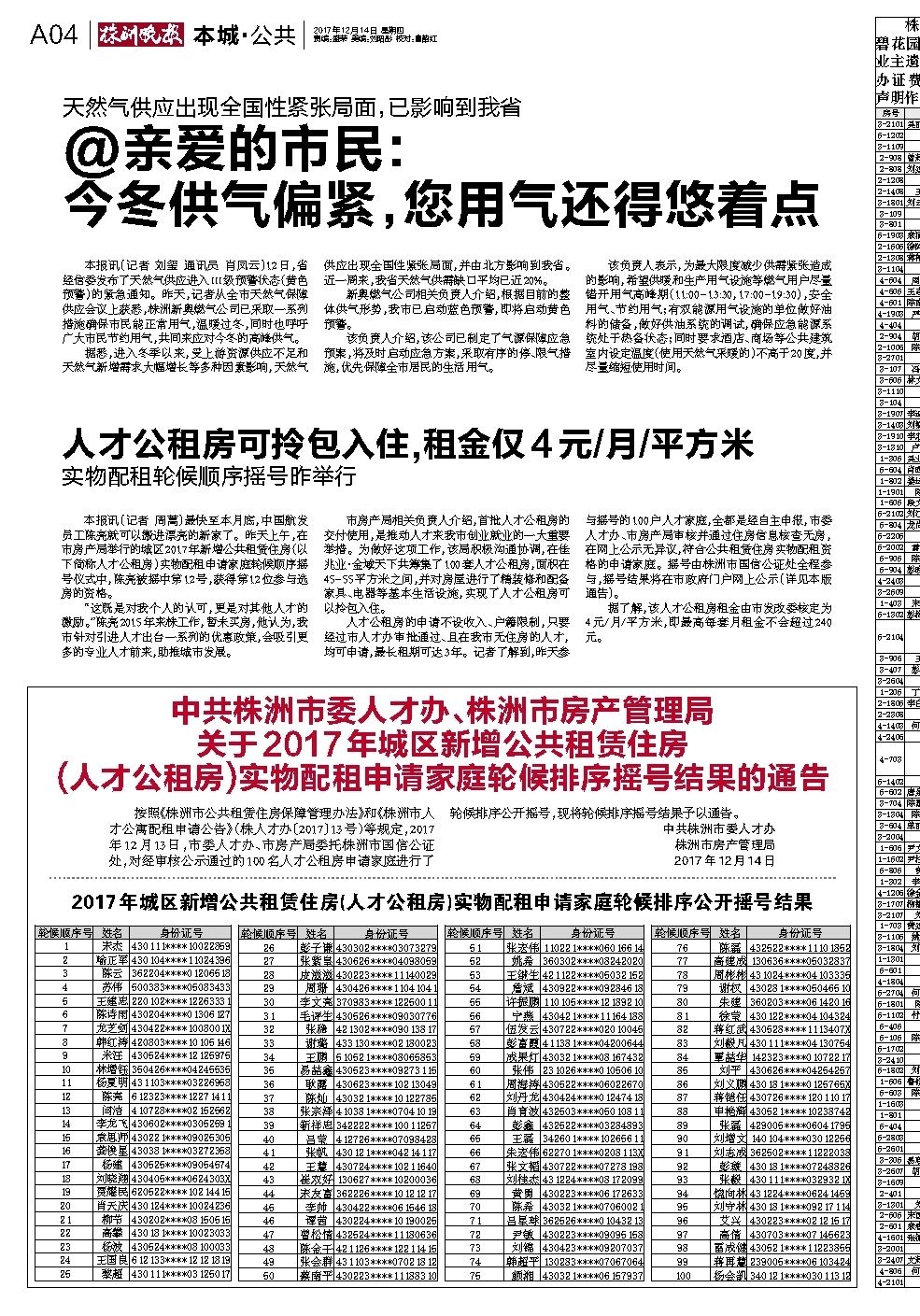 中共株洲市委人才办、株洲市房产管理局 关于2017年城区新增公共租赁住房 (人才公租房)实物配租申请家庭轮候排序摇号结果的通告