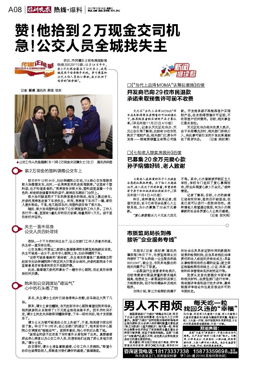 赞!他拾到2万现金交司机 急!公交人员全城找失主