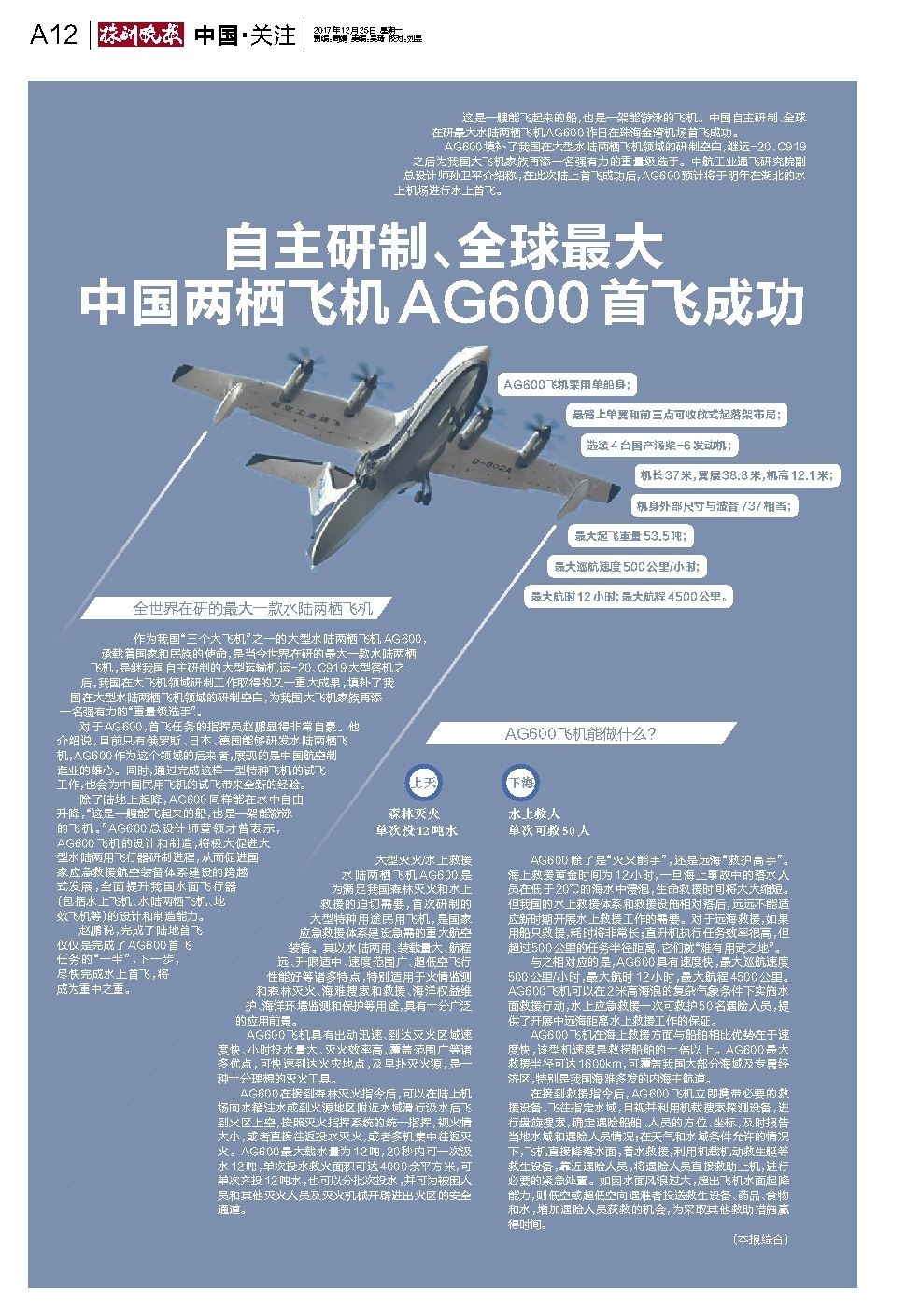 自主研制、全球最大中国两栖飞机AG600首飞成功