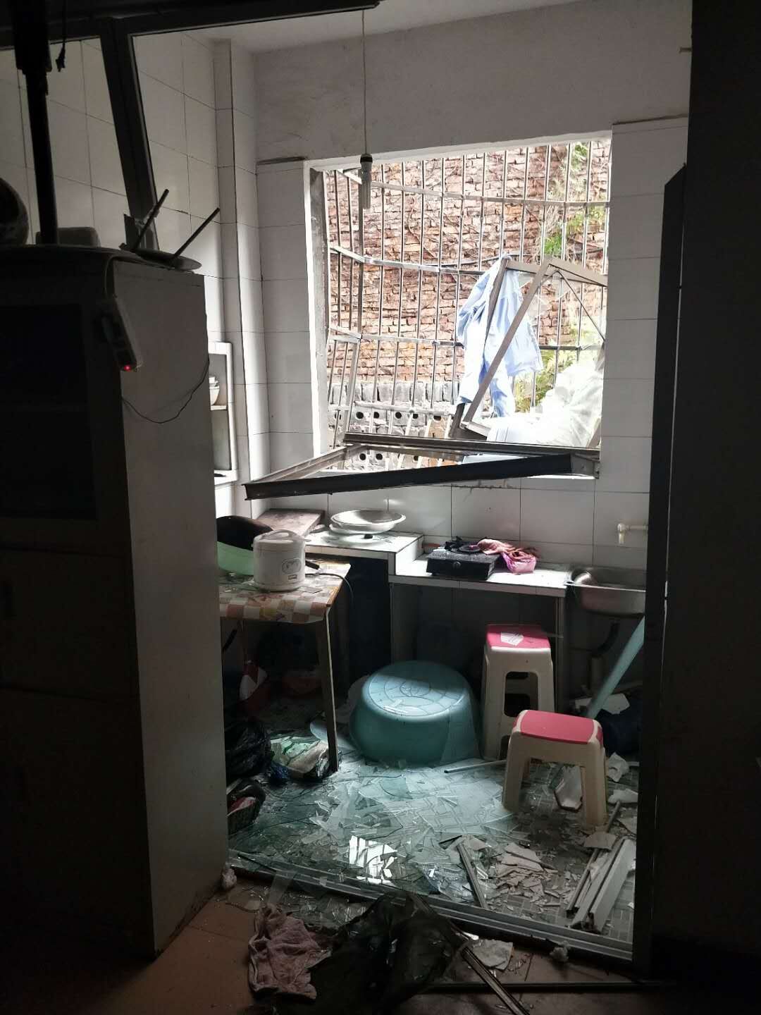 ▲厨房内的铝合金窗被震落,满地碎玻璃 记者 刘玺 摄