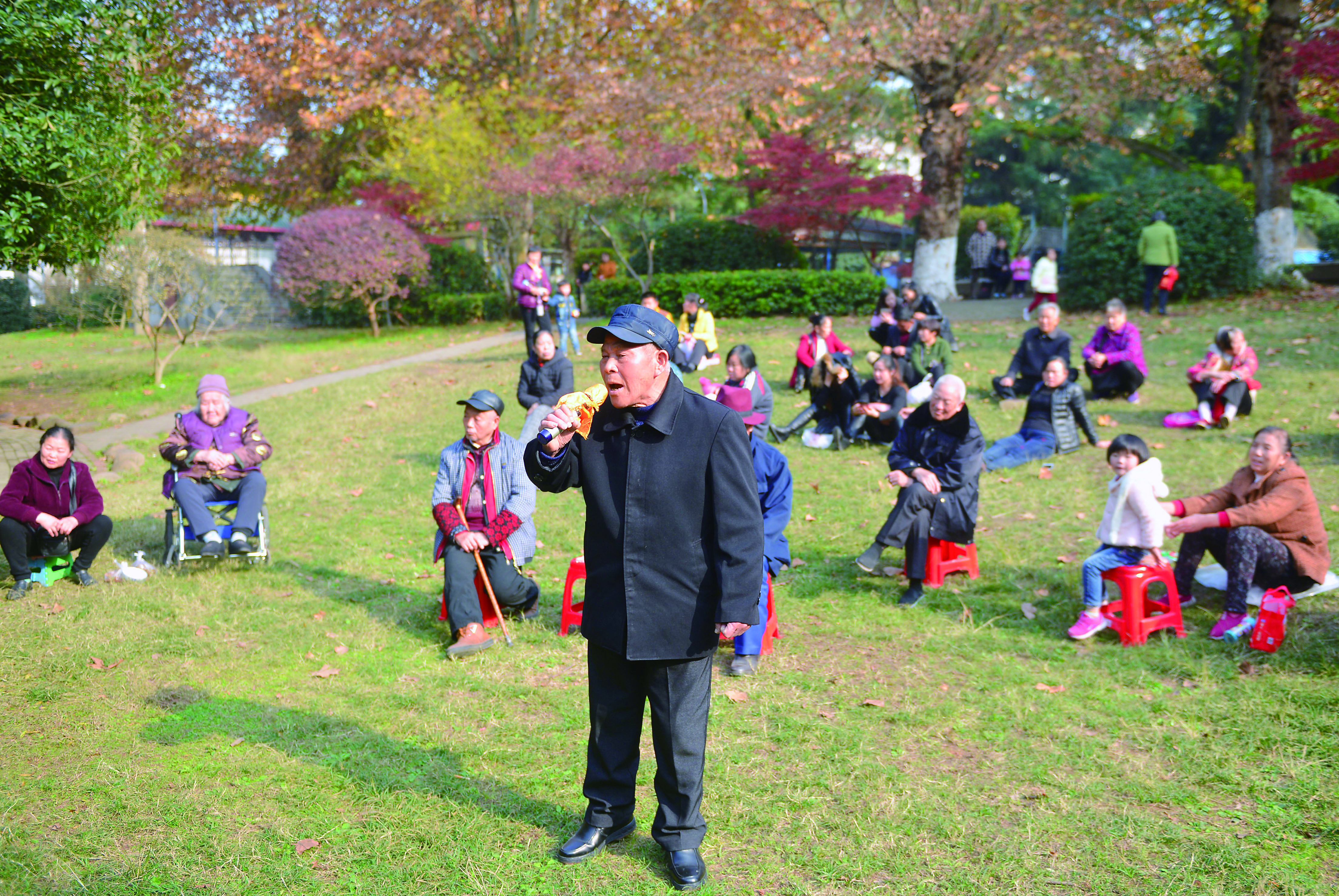 温暖的阳光撒满了神农公园的每个角落,晒太阳的市民很多,传统乐器的锣鼓声不时响起,在公园入门不远处的一块草地上,许多老人正围着看一场精彩的演出,人群中央,一位上了年纪的老爷爷正唱着花鼓戏。