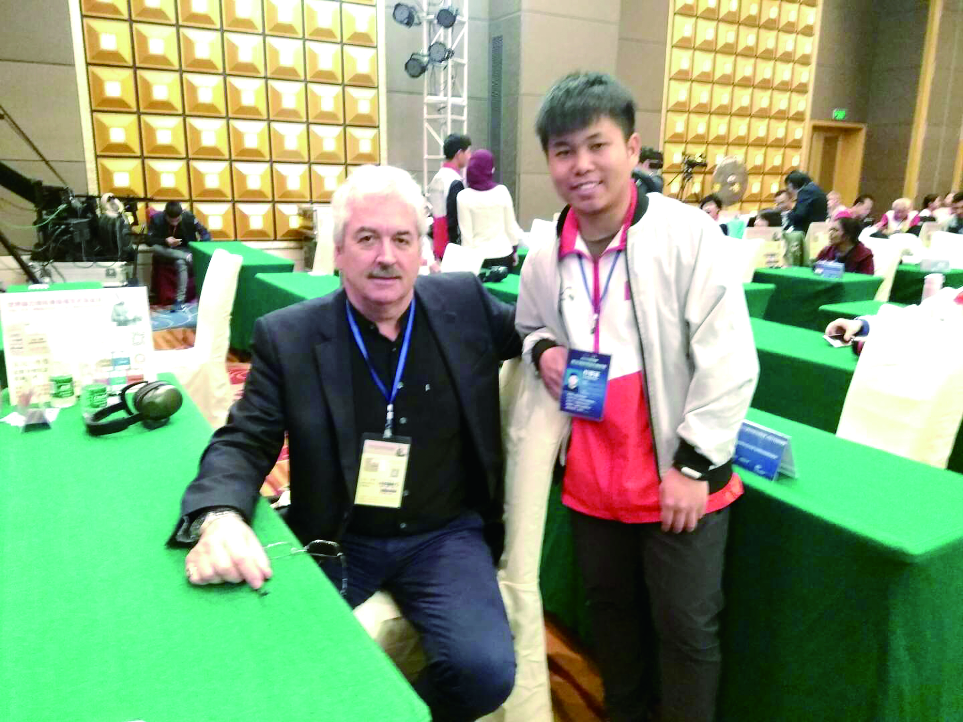 ◀昨天下午,李俊池在老师周现主的陪同下接受了现场考验。图为表演后,李俊池(右)和老师合影