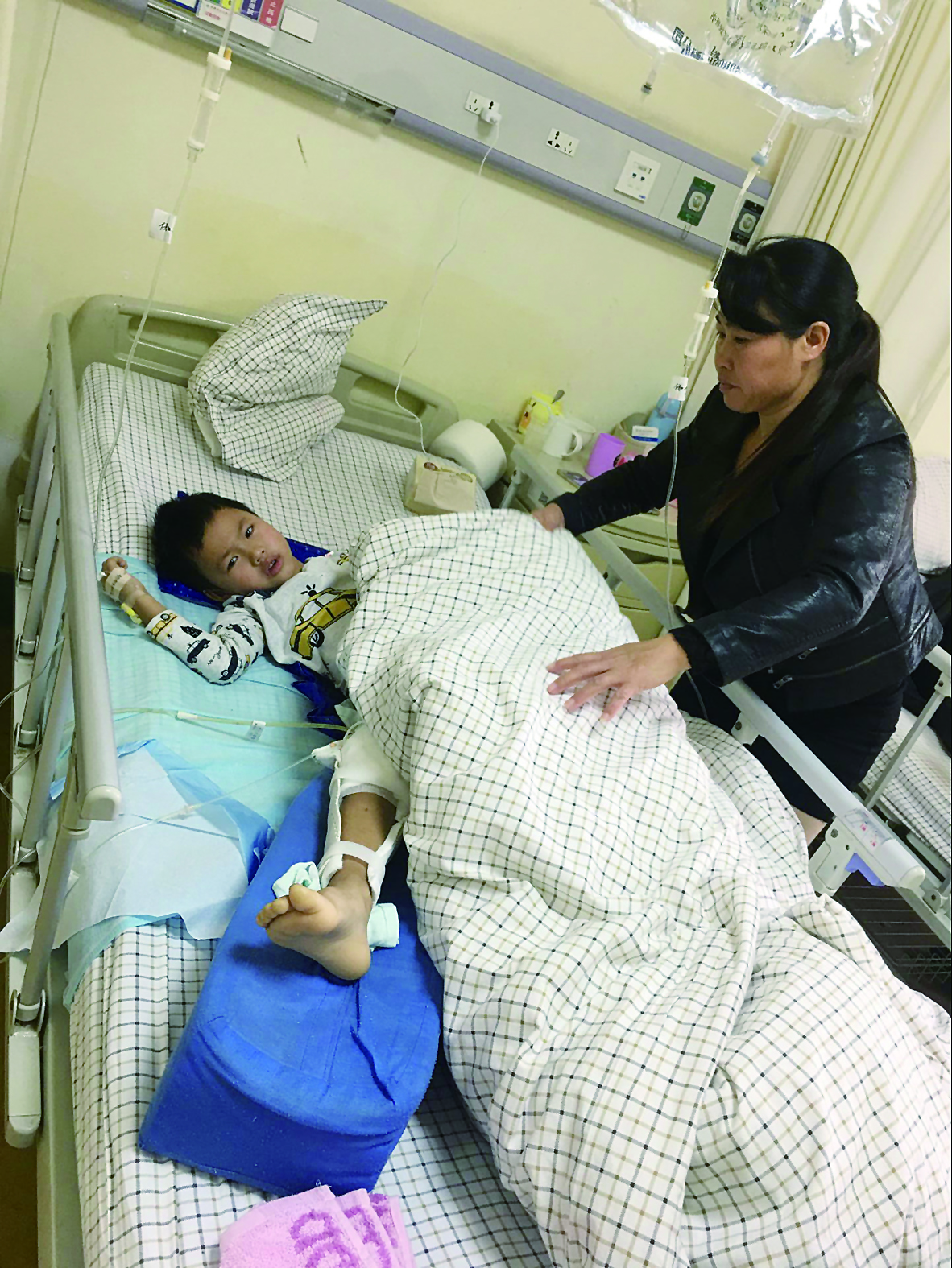 说起鹏鹏,他的妈妈陈四娇眼泪直流。陈四娇说,20多天前,她接到老师的电话,称鹏鹏在学校里摔倒了,虽然看不出什么外伤,但孩子一直喊脚疼。“我去接鹏鹏时,他站都站不稳了。”陈四娇赶紧背着儿子到了县城医院,照了片,医生说照片显示骨头没问题,开了些中药就回家了。